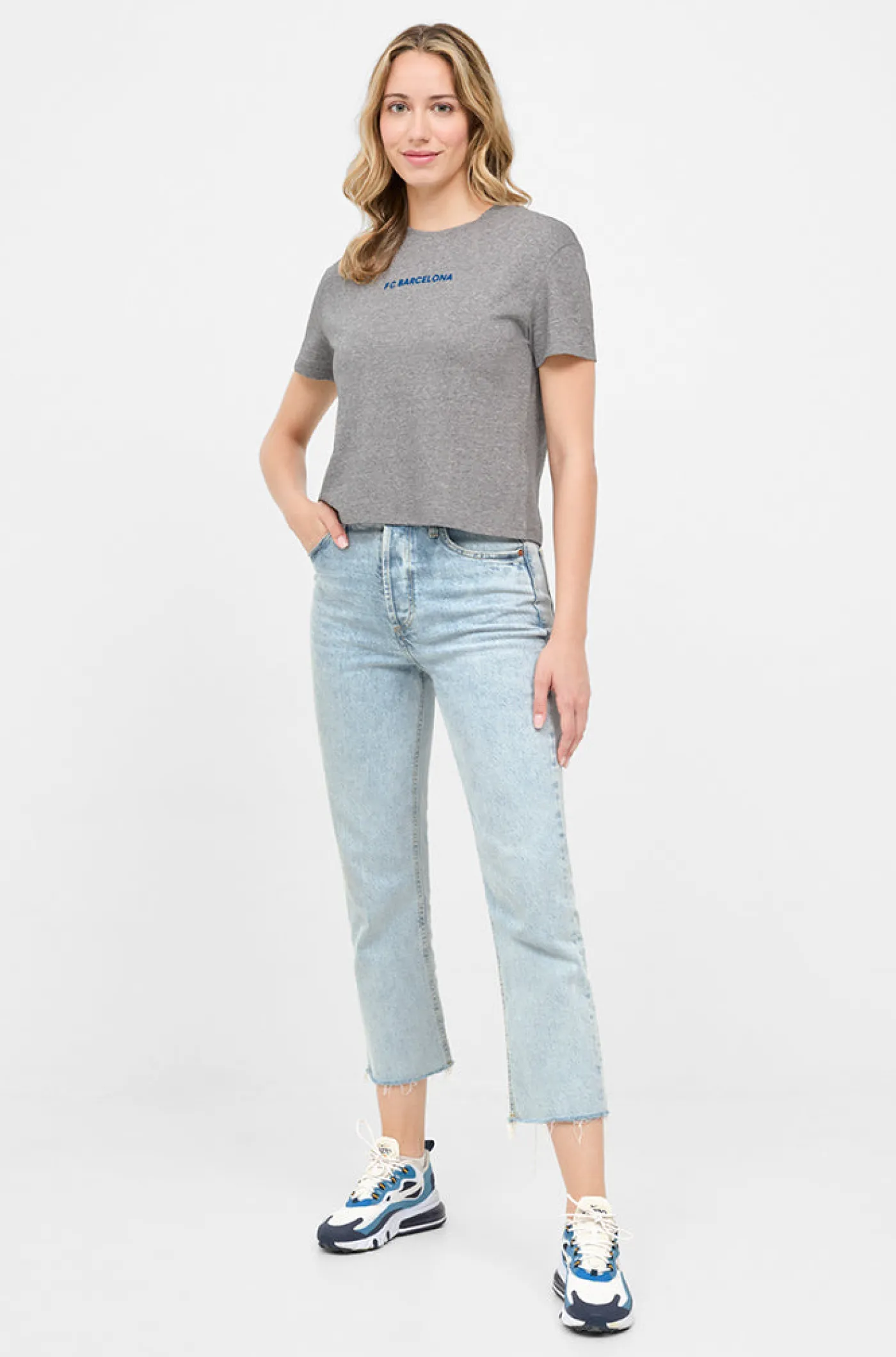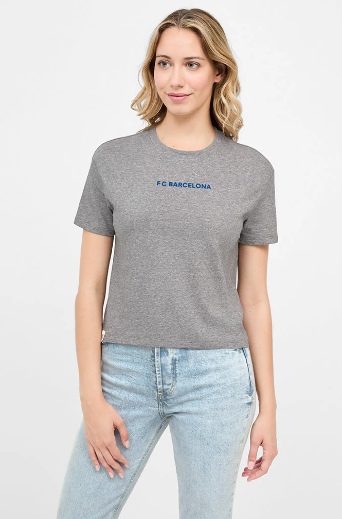 Camiseta de corte crop con texto en relieve del FC Barcelona de Color: azul en la parte delantera. Cuello redondo. Manga corta. Ideal para presumir de look y equipo. Prenda sostenible está hecha a partir de tejidos orgánicos y/o reciclados. Color: gris jaspeado. Venta exclusiva de Barça Stores