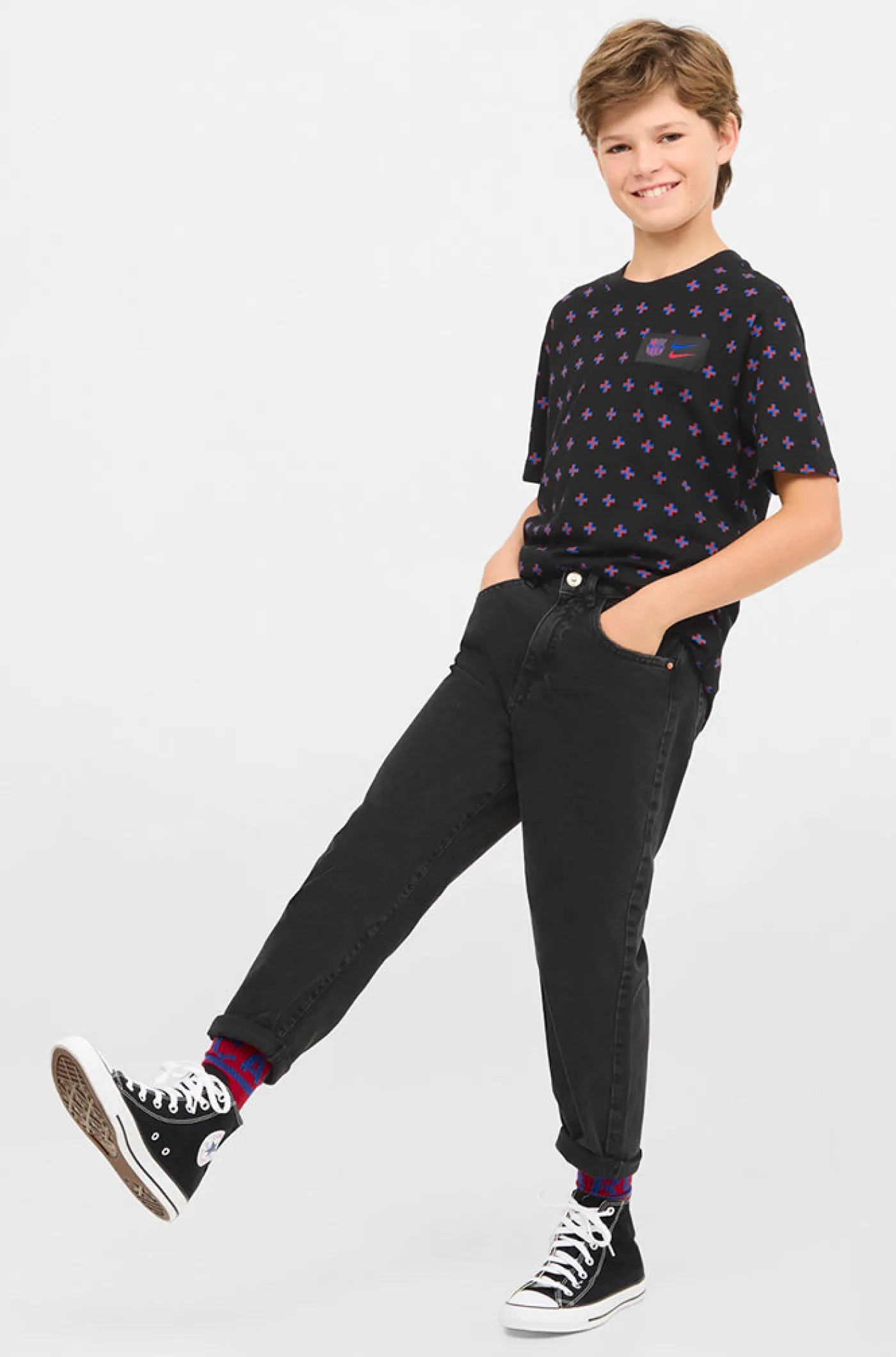 Camiseta de manga corta para niños/as de 6 a 14 años con estampado de los escudos del FC Barcelona. Su tejido de algodón la convierte en una prenda cómoda y ligera. Cuello redondo. Color: negro.