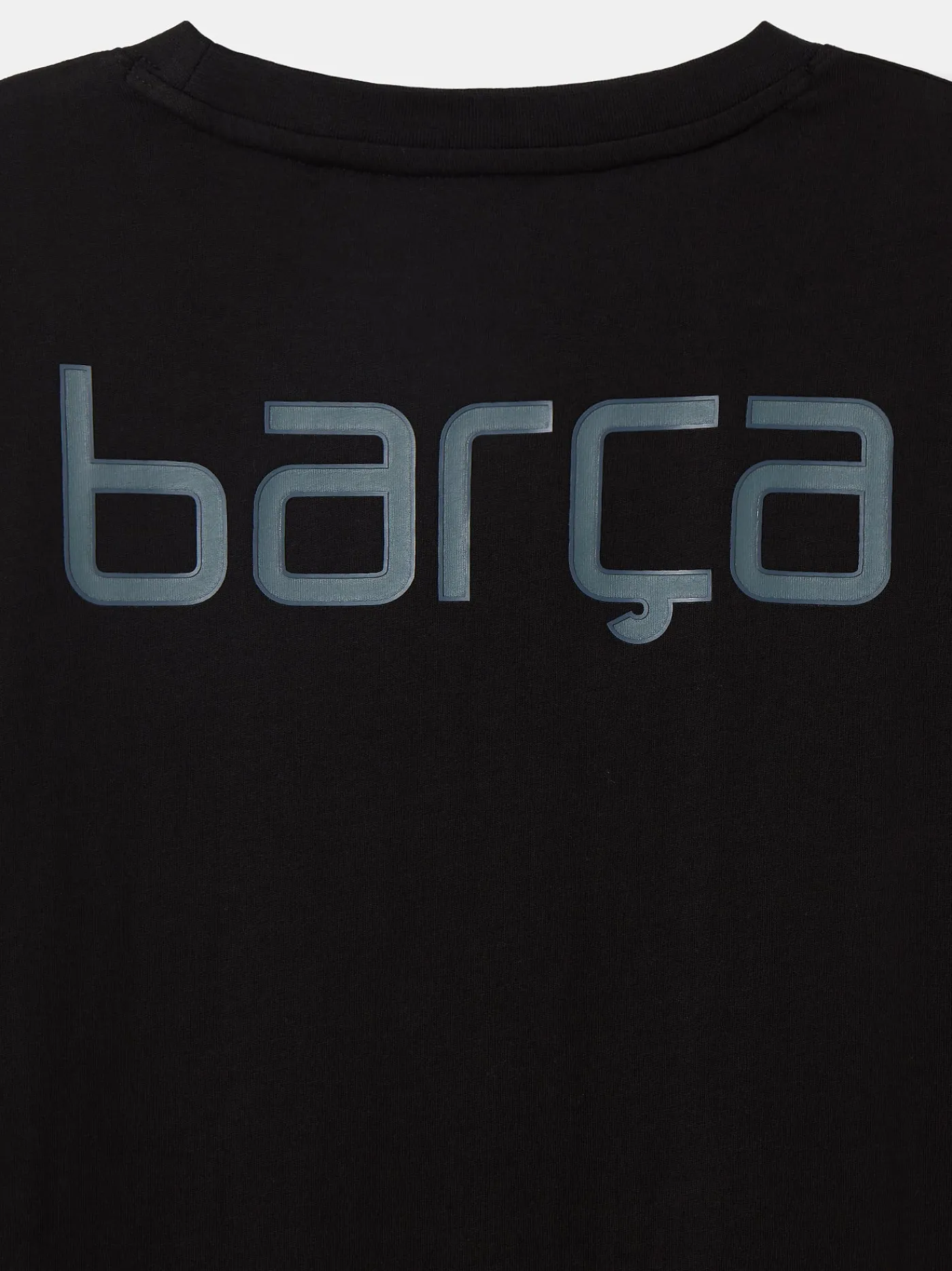 Camiseta negra de manga corta con escudo estampado en el lado izquierdo y detalle blaugrana en el lado derecho. Texto «B…