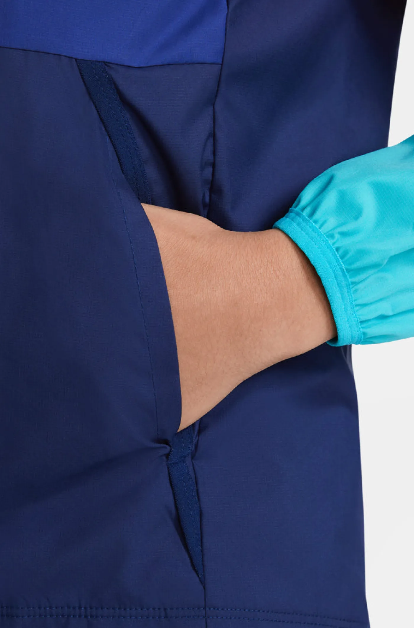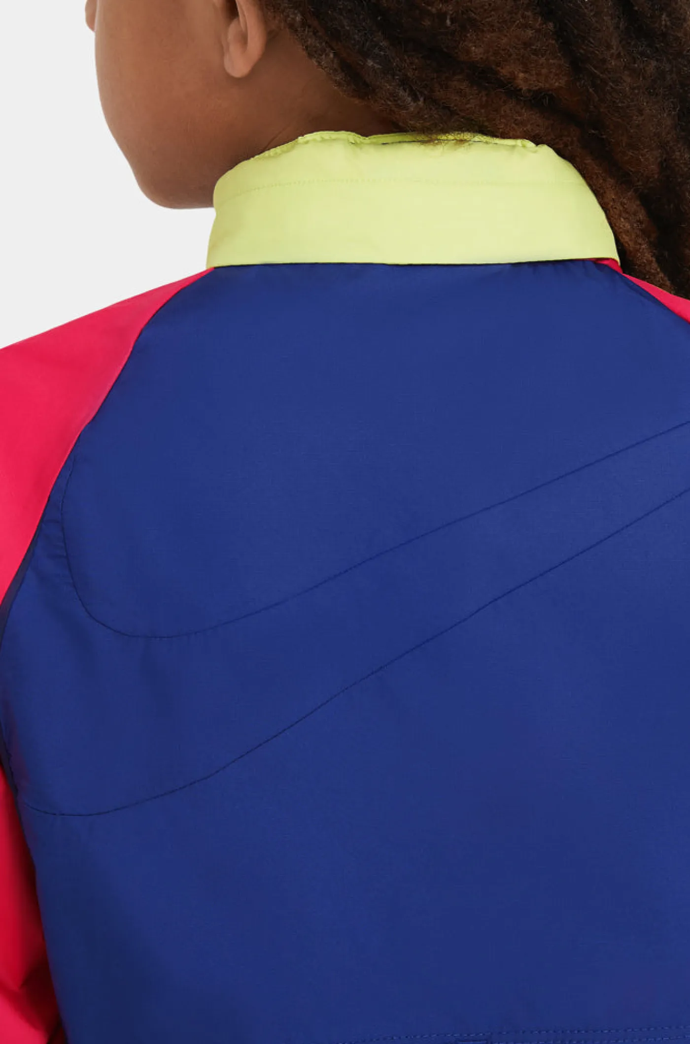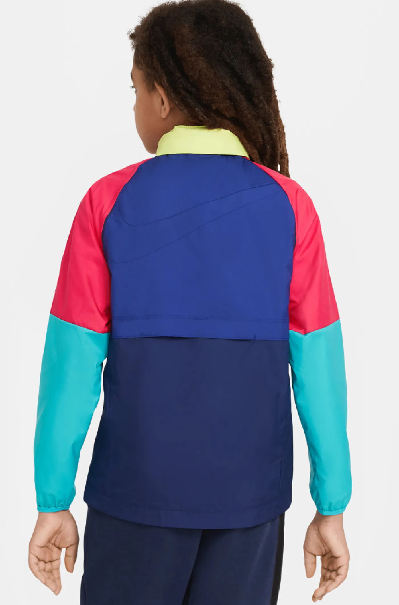 Chaqueta cortavientos para niños de entrenamiento con parche del escudo del FC Barcelona y logo de Nike en el pecho. Cuello alto con capucha plegable. La parte trasera cuenta con una abertura de ventilación. Cierre con cremallera. Manga larga con puño elástico. Dos bolsillos laterales. Forro interior de malla. Tecnología Dri-FIT de Nike. Color: azul marino, azul noche, coral, amarillo pastel y turquesa