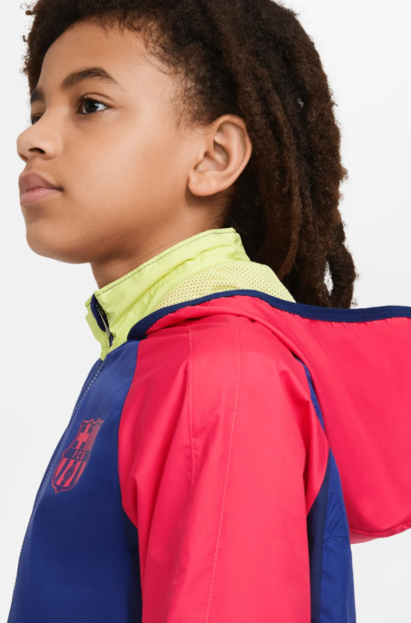 Chaqueta cortavientos para niños de entrenamiento con parche del escudo del FC Barcelona y logo de Nike en el pecho. Cu…