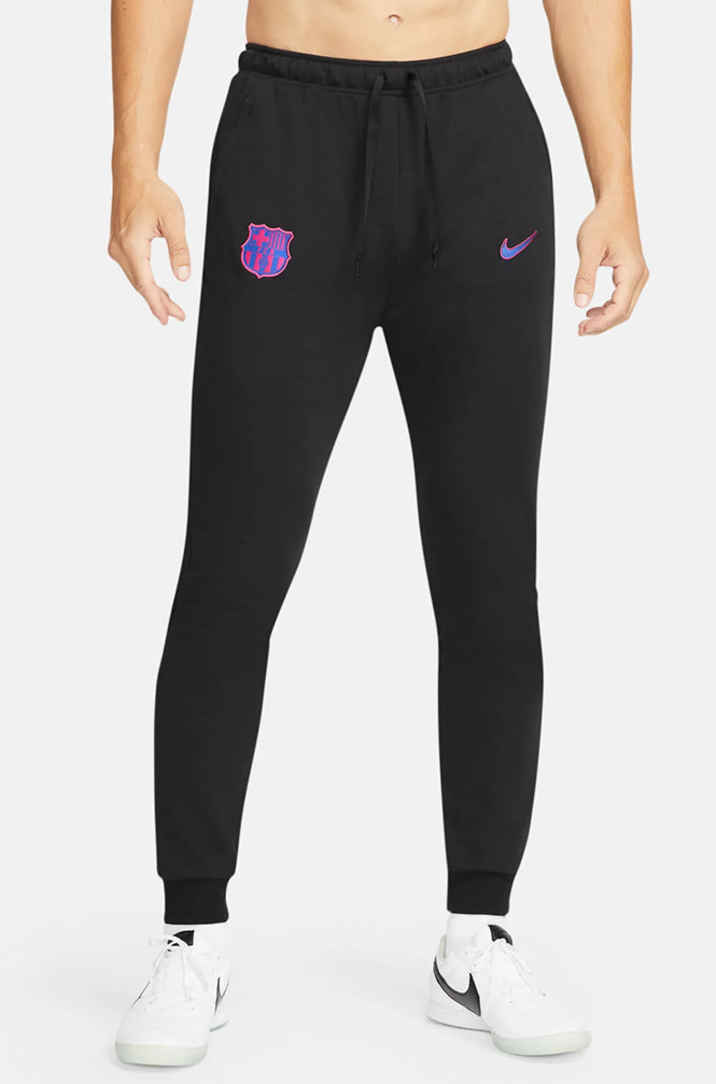 Pantalón deportivo con el parche del escudo de FC Barcelona y el logo de Nike bordado a contraste. Detalle de bandas negras con la rotulación de “Barça” en la parte posterior de las piernas. Cintura elástica con cordones. Bolsillos delanteros: 2 con cremallera bajo solapa. Bajo con acabado en canalé. Tecnología Dri-FIT de Nike. Color: Negro.