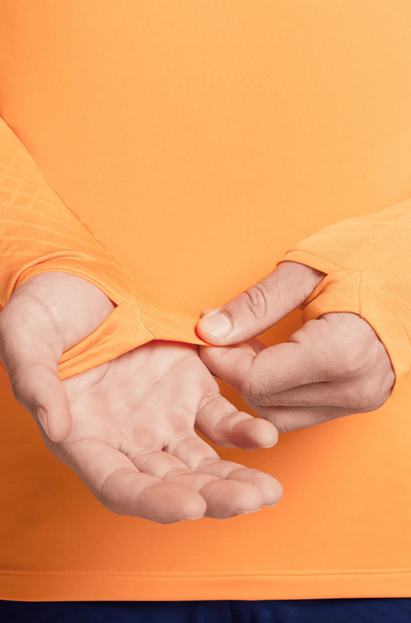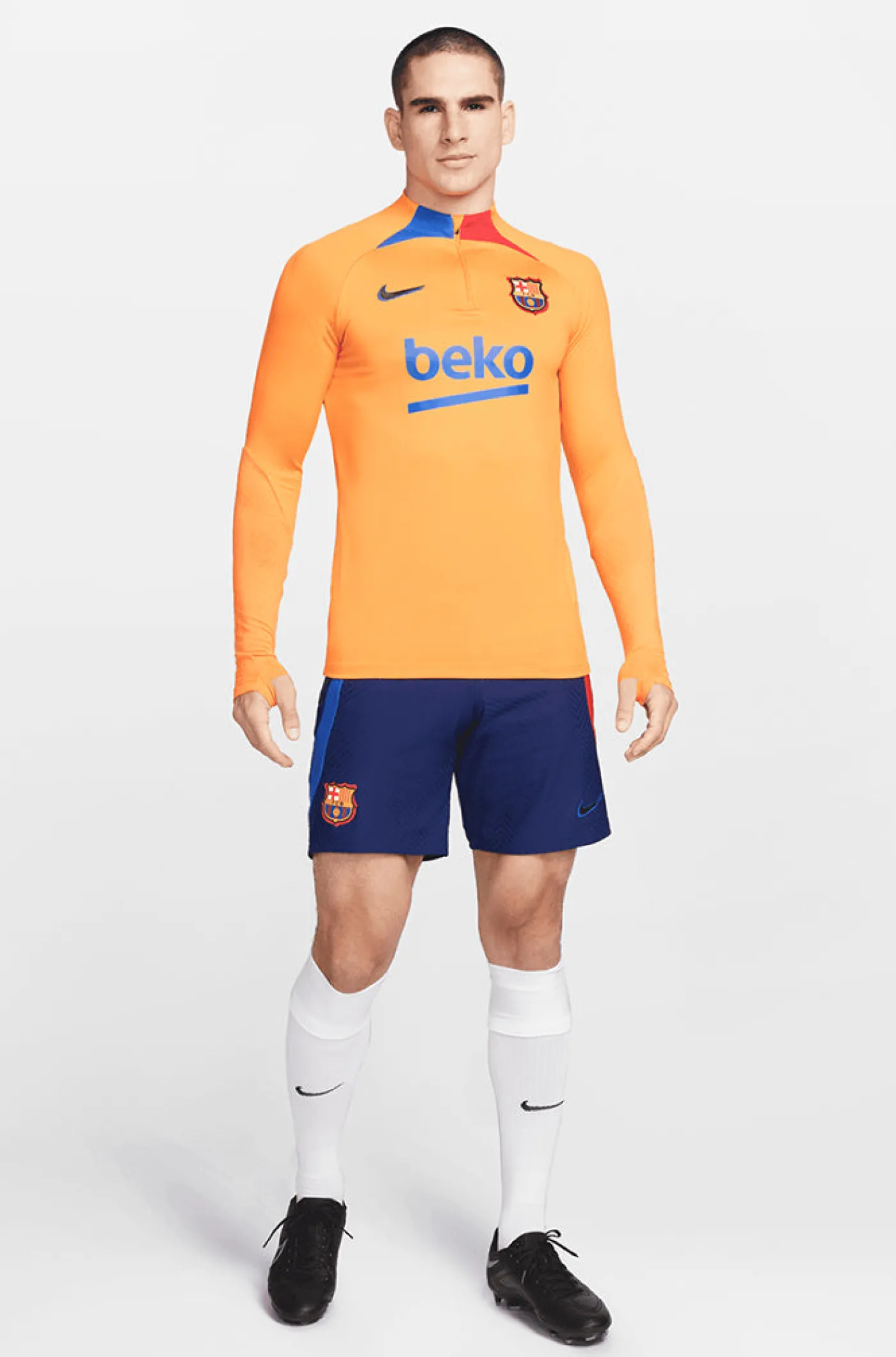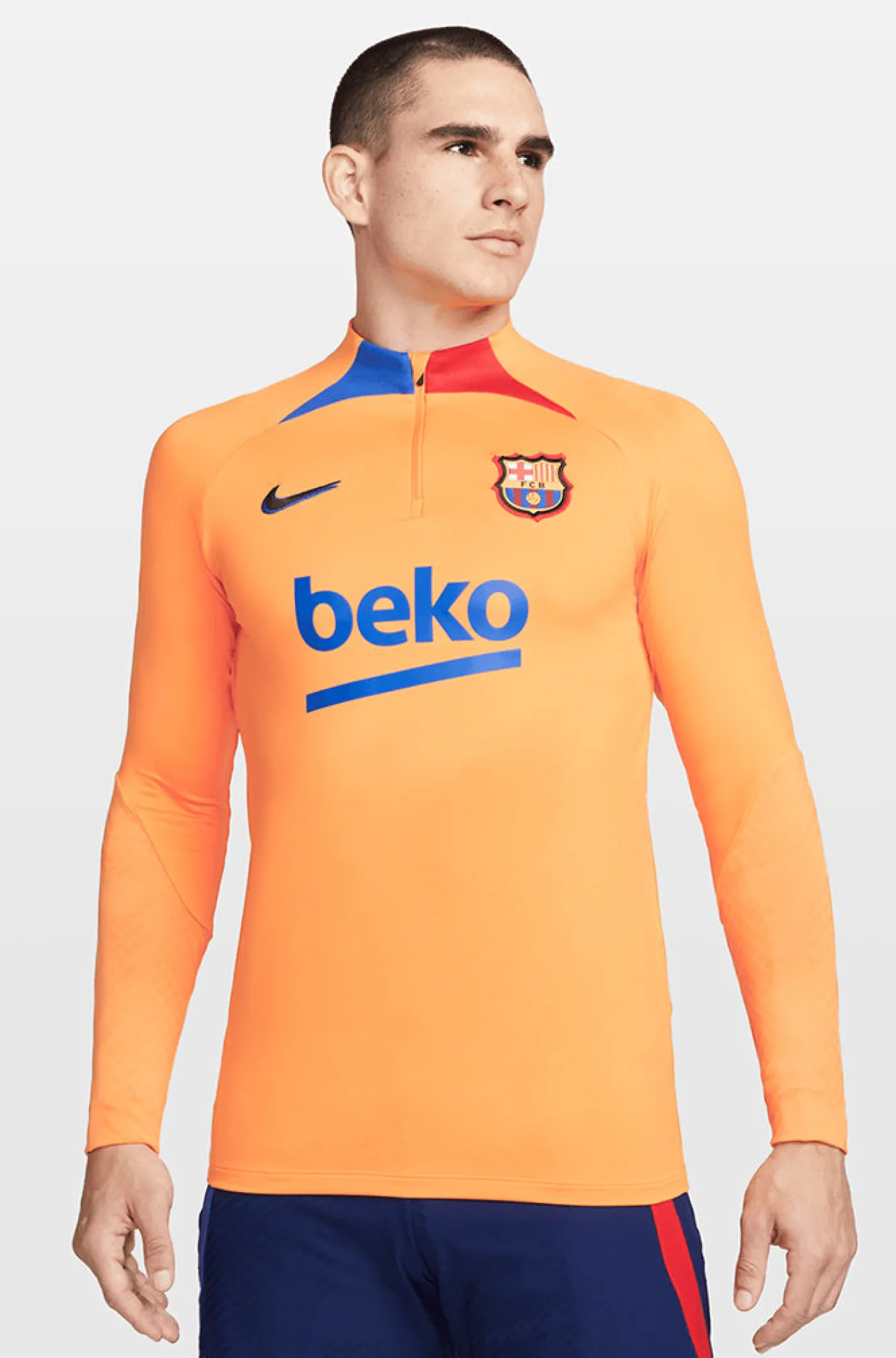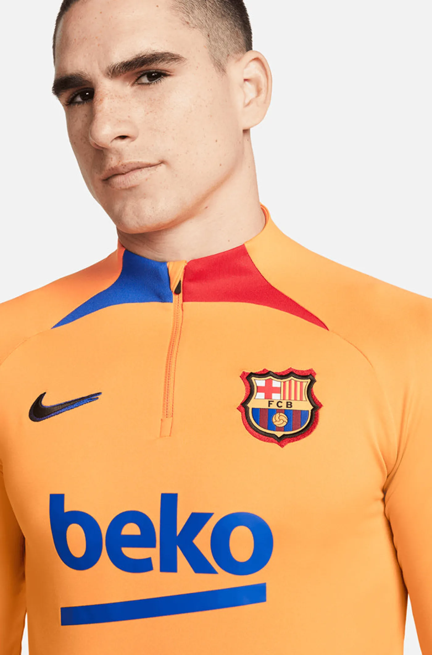 Sudadera de entrenamiento con el parche del escudo del FC Barcelona y el logo de Nike bordado en el pecho. Manga larga con grabado geométrico y decorada con una franja diagonal a contraste. Cuello redondo con cremallera. Detalle de ojal invisible para el pulgar. Tecnología Dri-FIT de Nike. Color: naranja