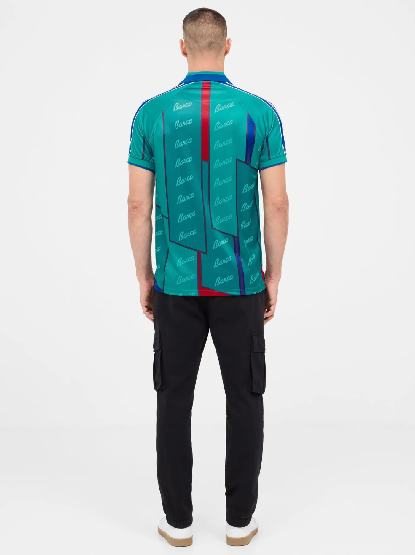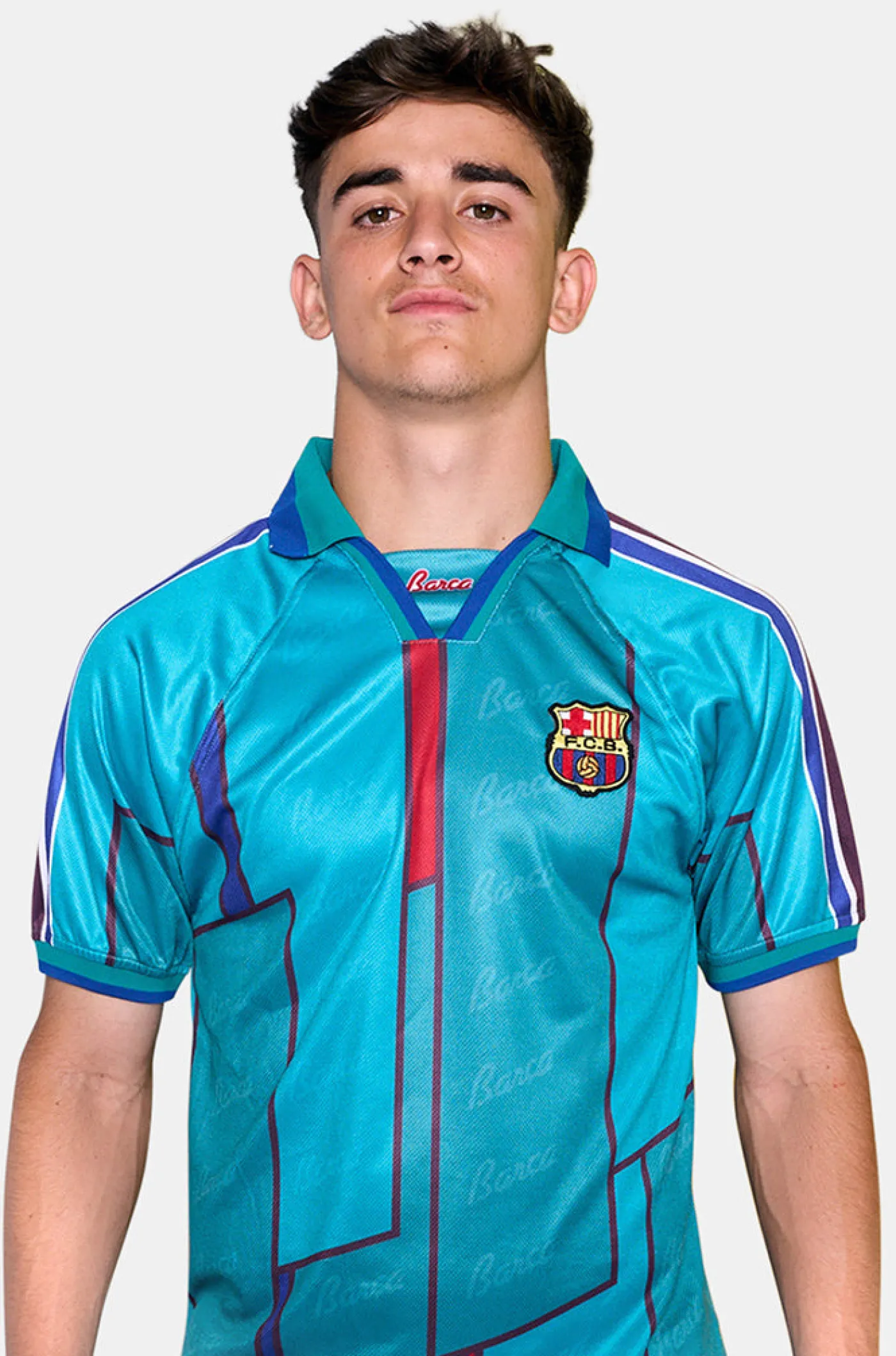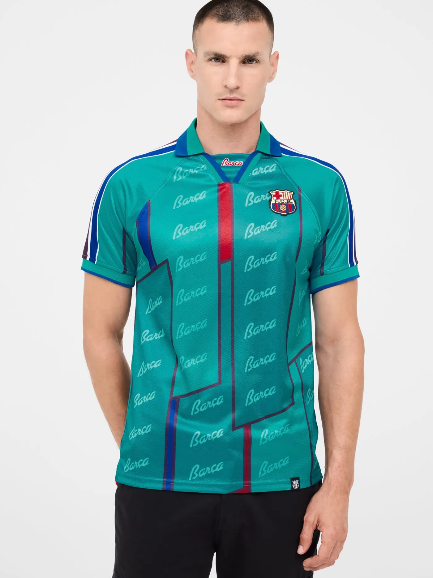 Réplica de la camiseta de la equipación del FC Barcelona en las temporadas 1995-97. Siguiendo el mismo patrón y buscando los tejidos más similares posibles a la original. Cuello con solapa. Manga corta. Color: Azul turquesa.