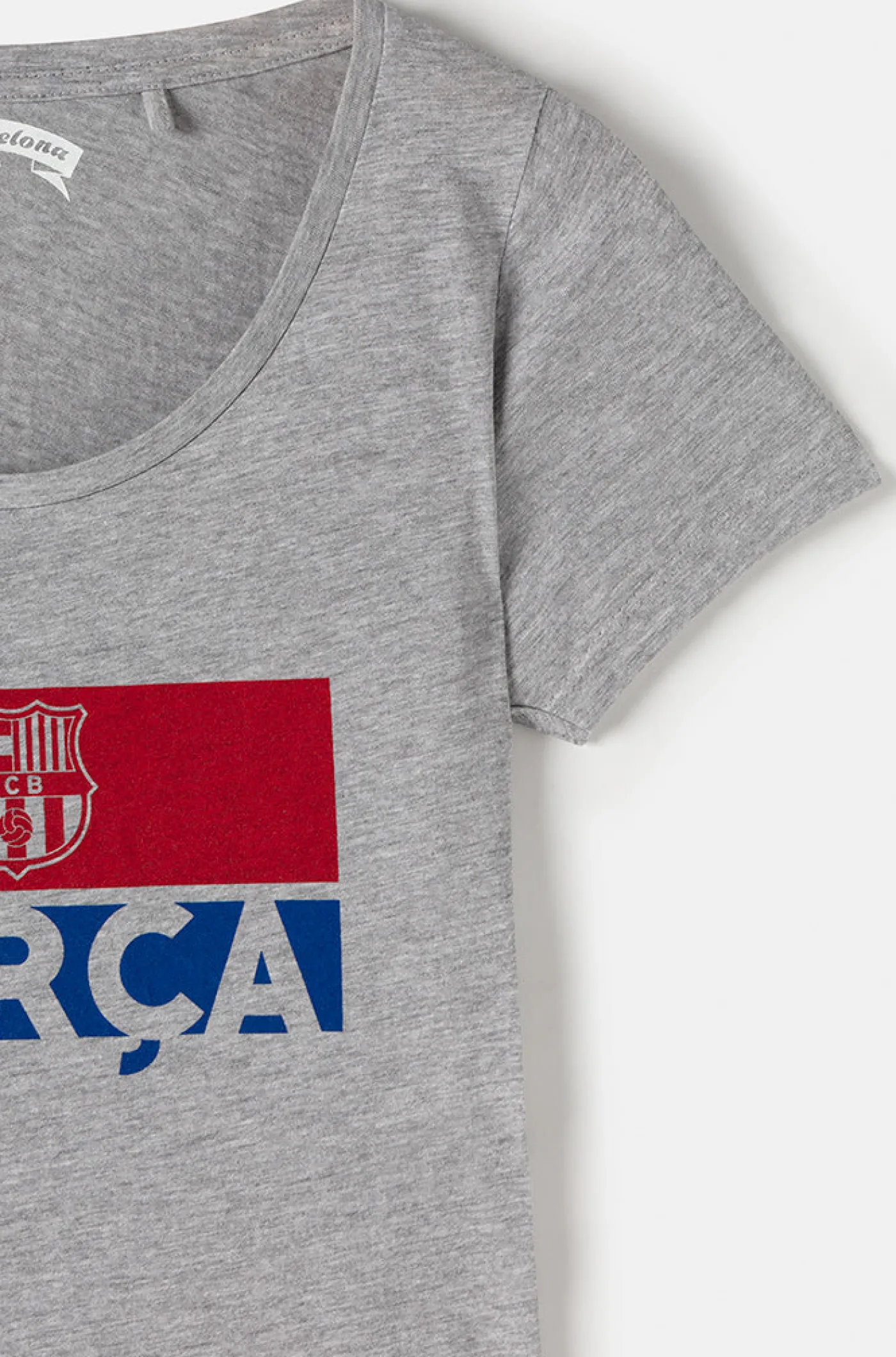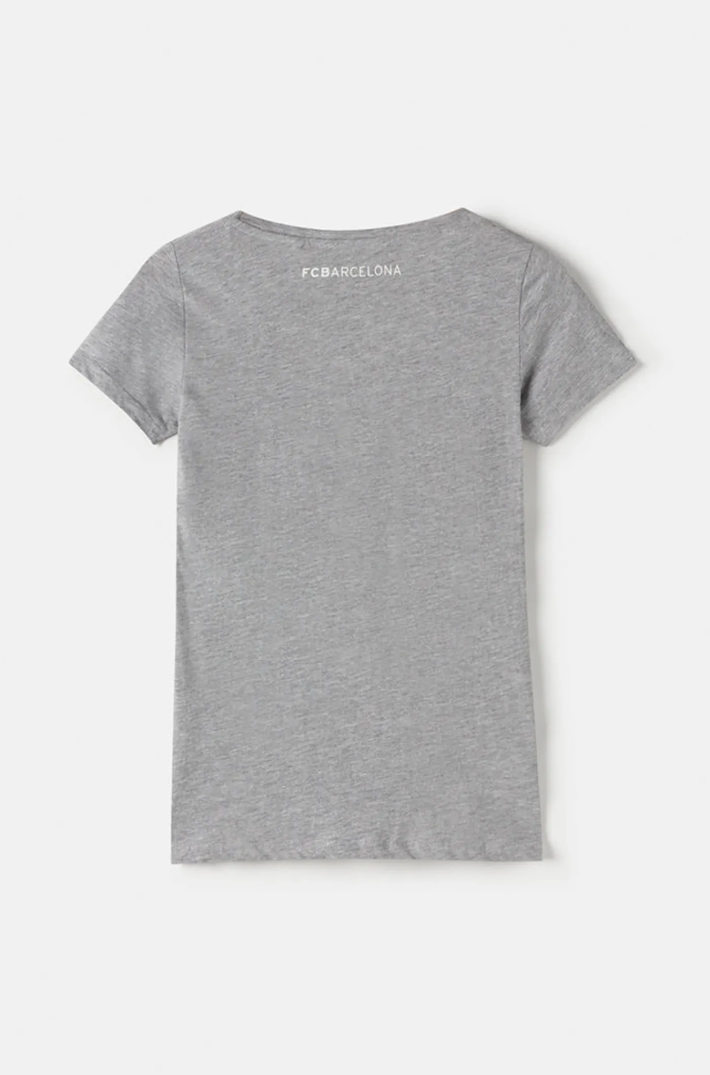 Camiseta mujer de manga corta con el escudo del FC Barcelona y logo del Barça en un fondo de color azulgrana. Cuello scoop. Regular Fit. Color: Gris jaspeado.
