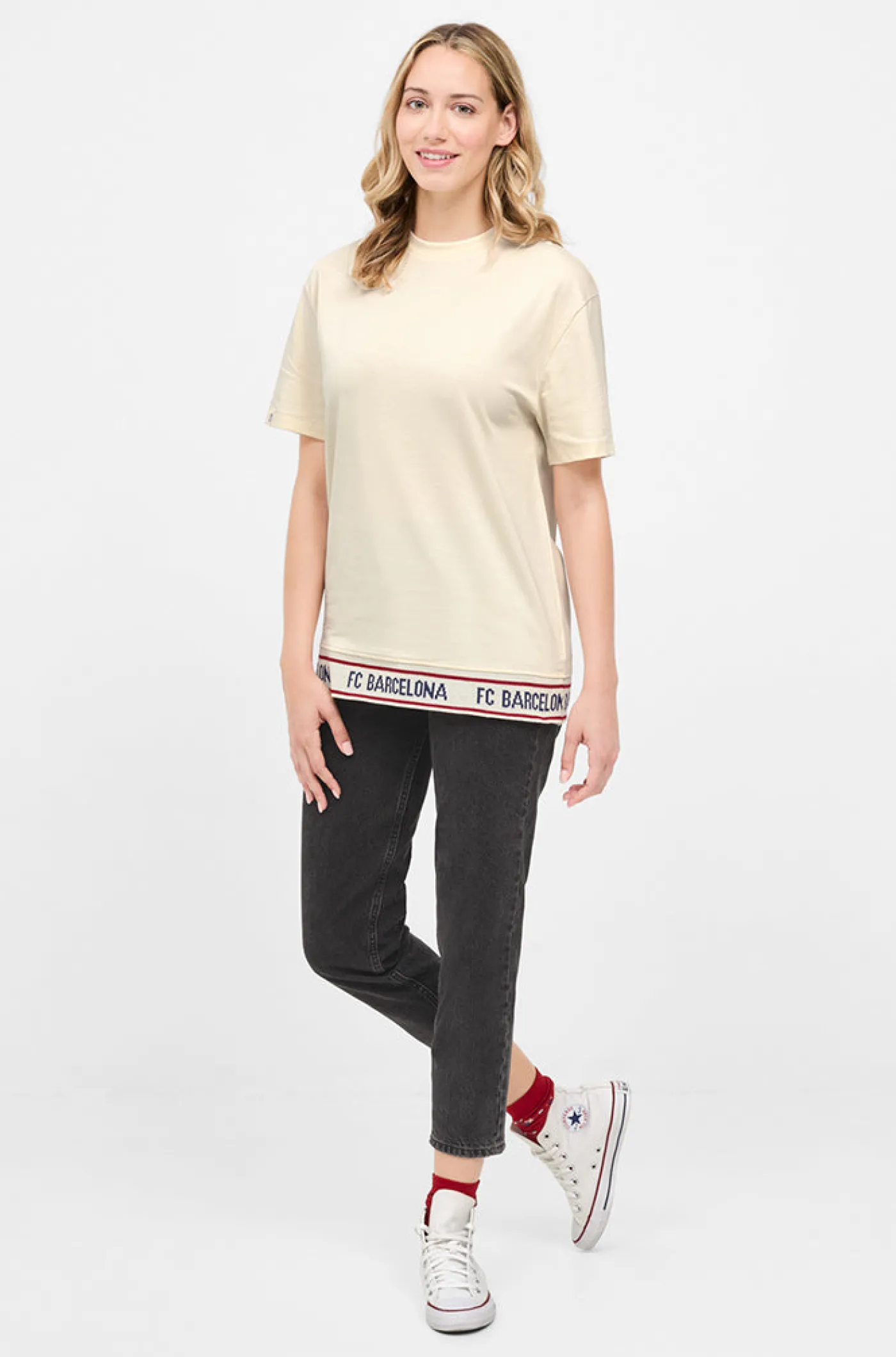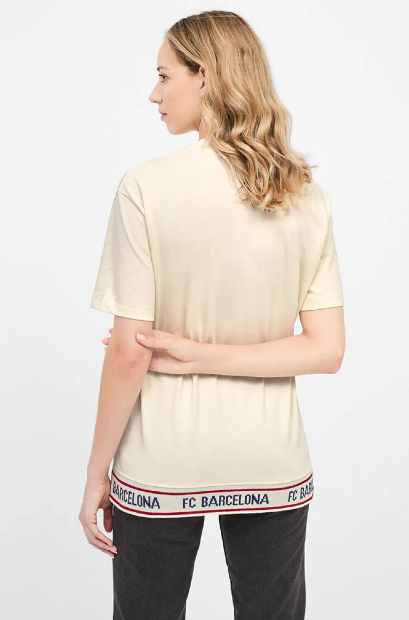 Camiseta larga con banda decorativa y estampación del logo FC Barcelona en la cintura. Cuello redondo. Manga corta. Prenda sostenible está hecha a partir de tejidos orgánicos y/o reciclados. Color: Beige. Venta exclusiva de Barça Stores