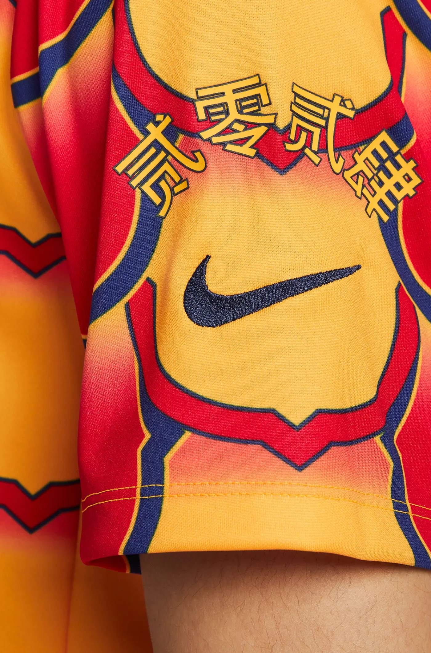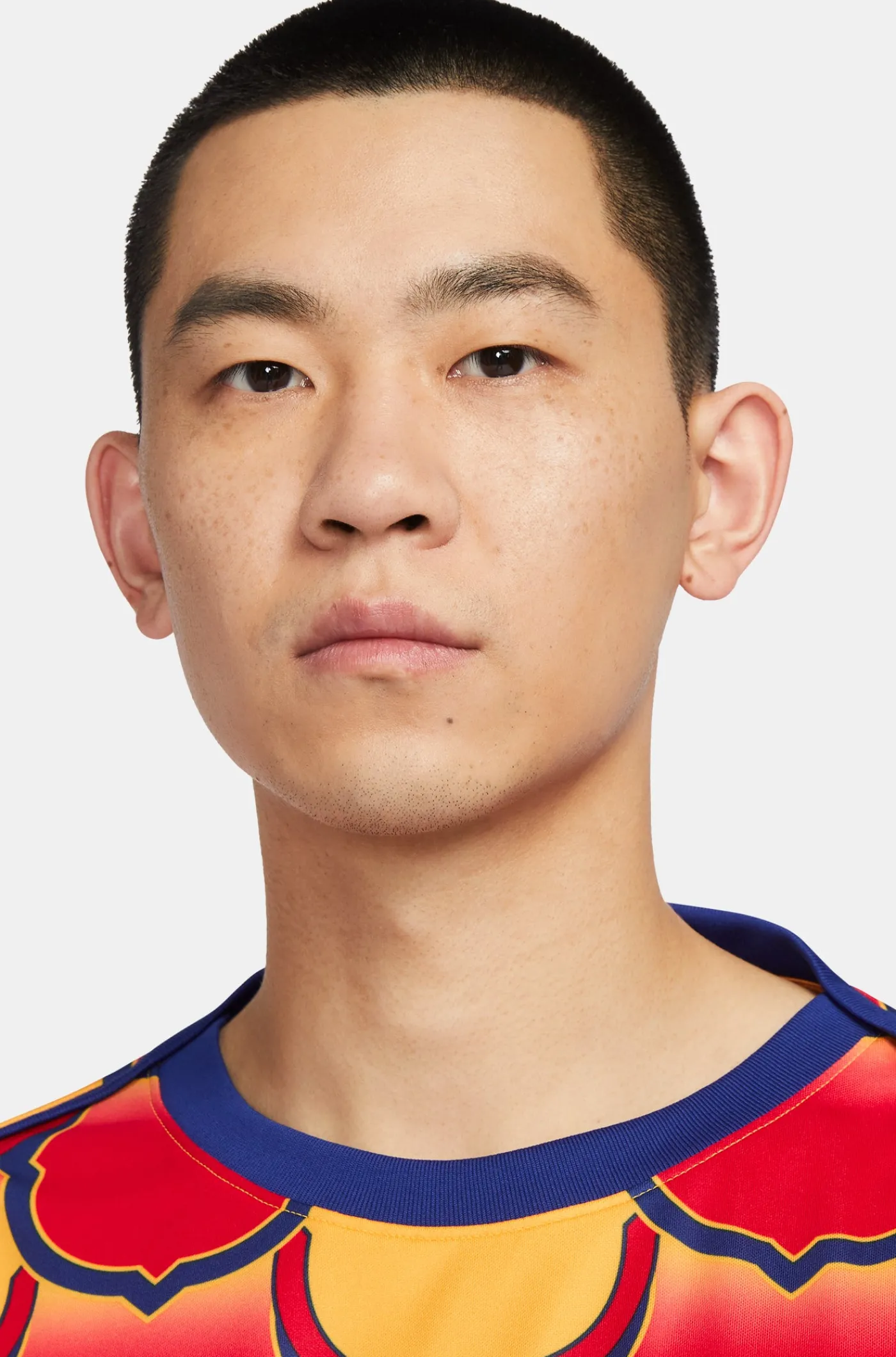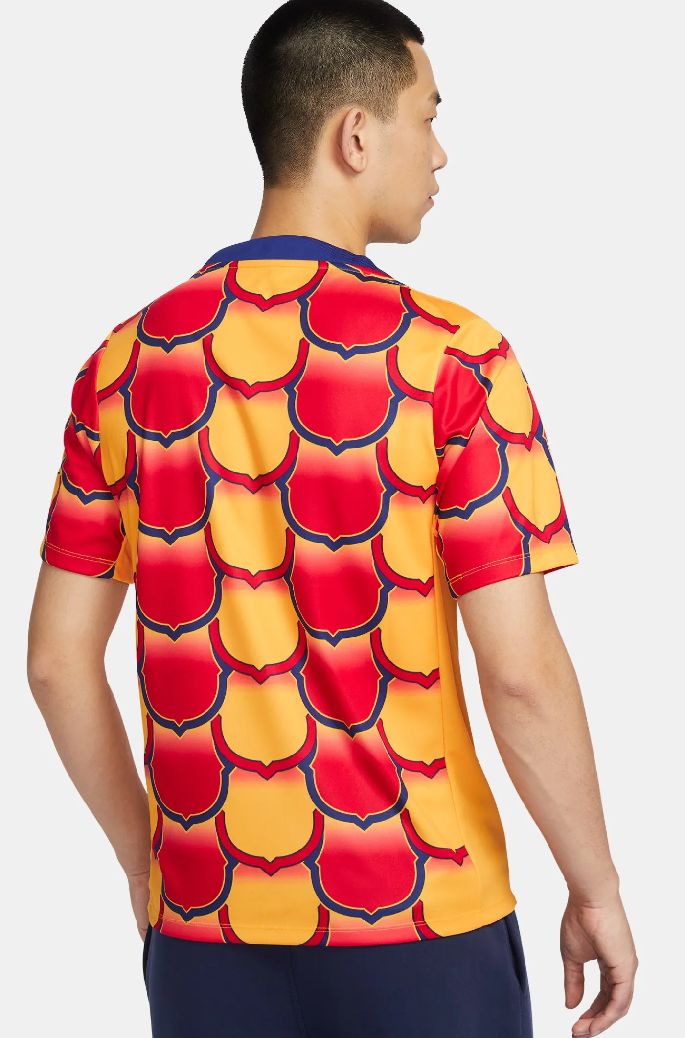 Camiseta prepartido del FC Barcelona de la temporada 23/24, que usan los jugadores del primer equipo para calentar antes de salir al terreno de juego durante los partidos. Camiseta con parche del escudo del FC Barcelona y logo de Nike bordado. Escote redondeado. Mangas cortas. Tecnología Nike Dri-FIT. Color: rojo y dorado.