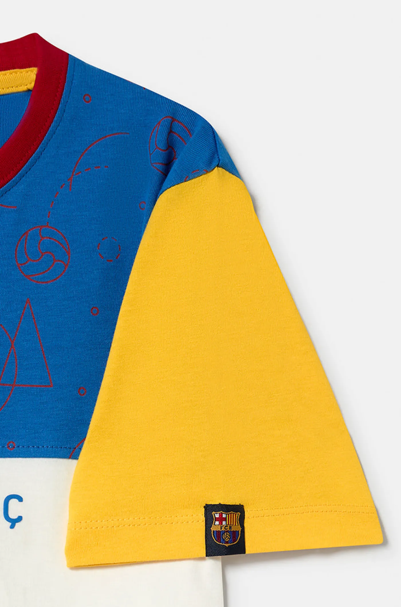 Camiseta beig para bebés con la rotulación “Barça” en relieve y a contraste en la parte frontal, con estampado de formas geométricas a contraste. Cuello redondo. Manga corta. Color: beig, azul y amarillo.