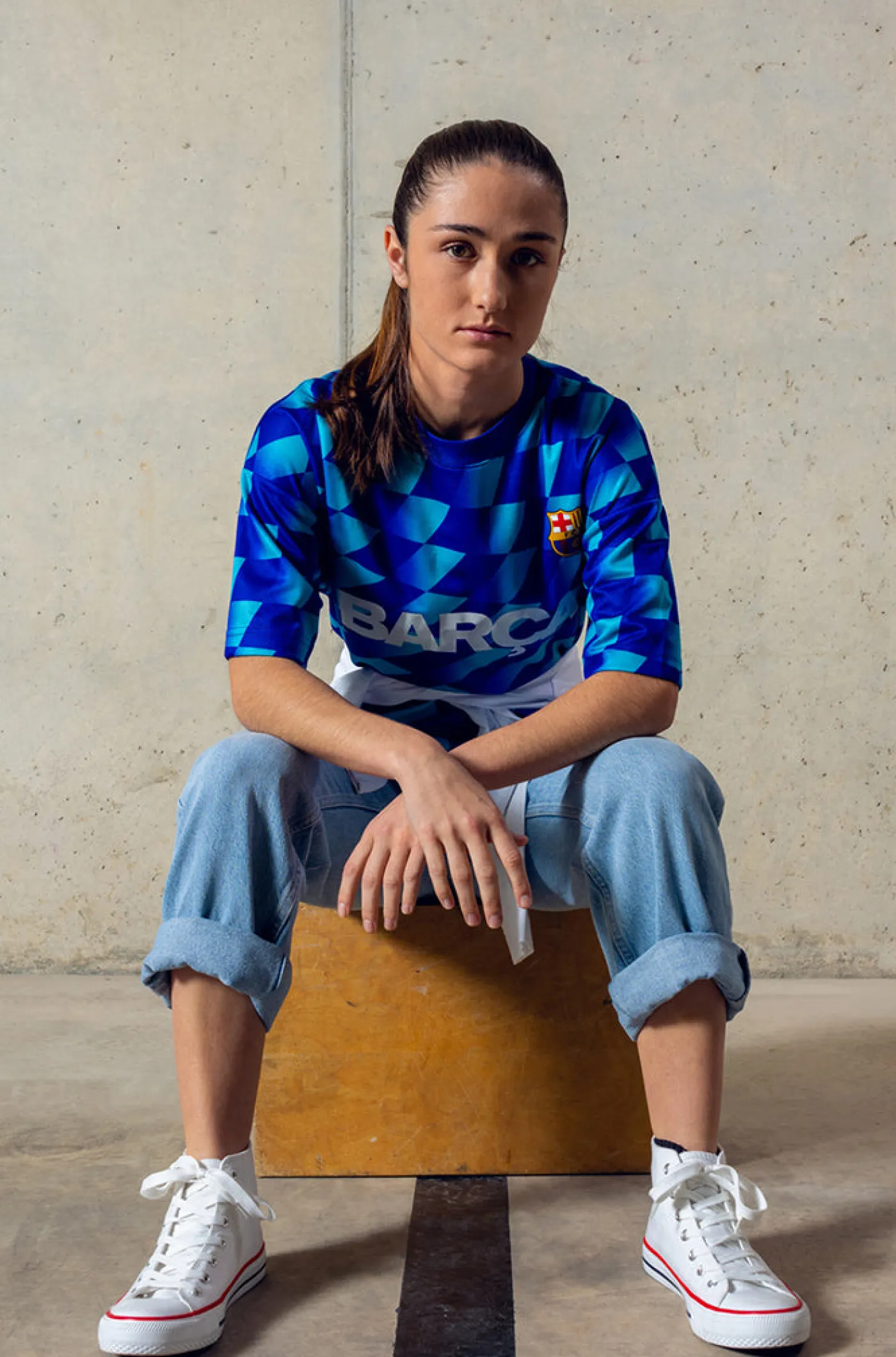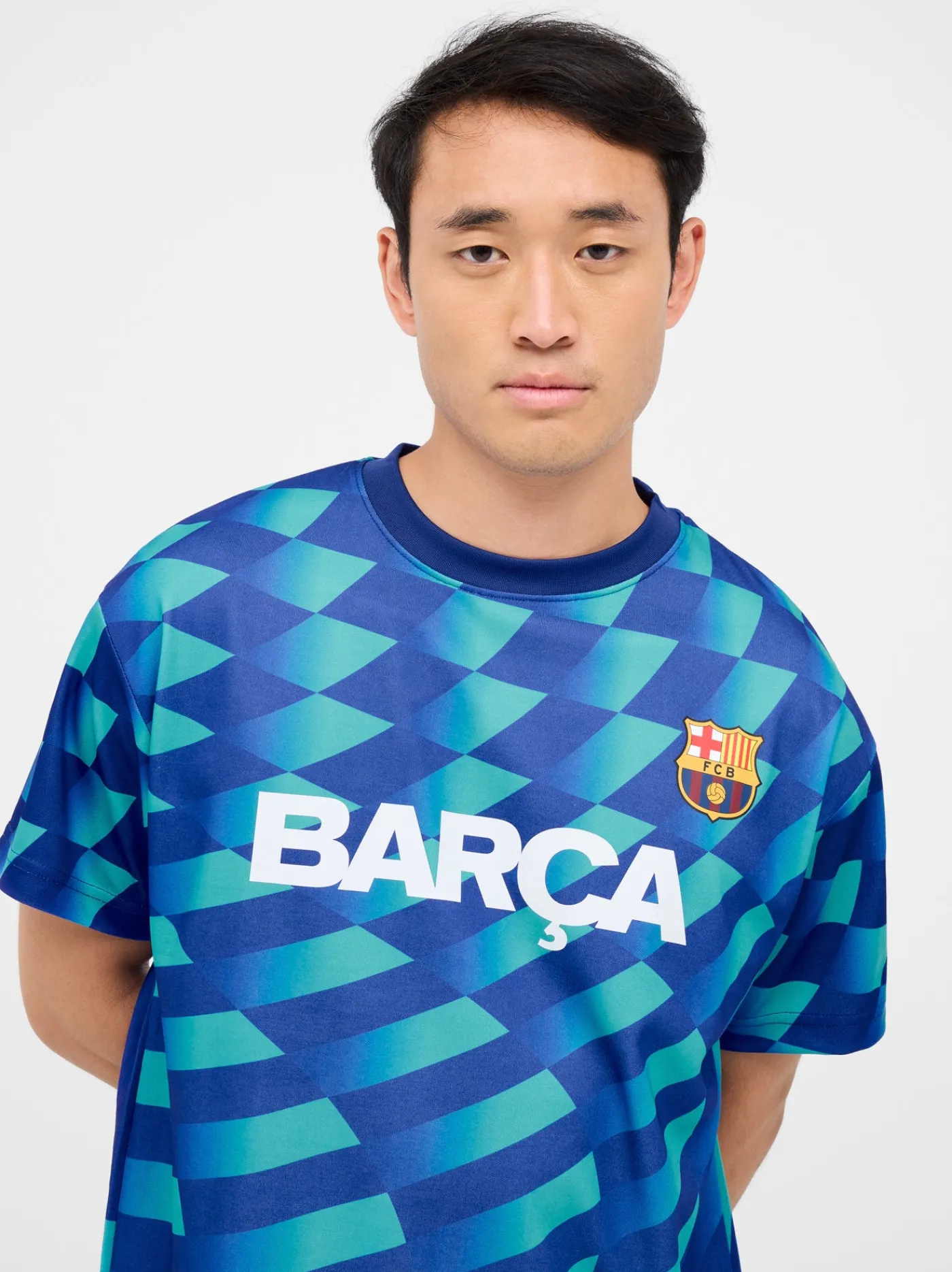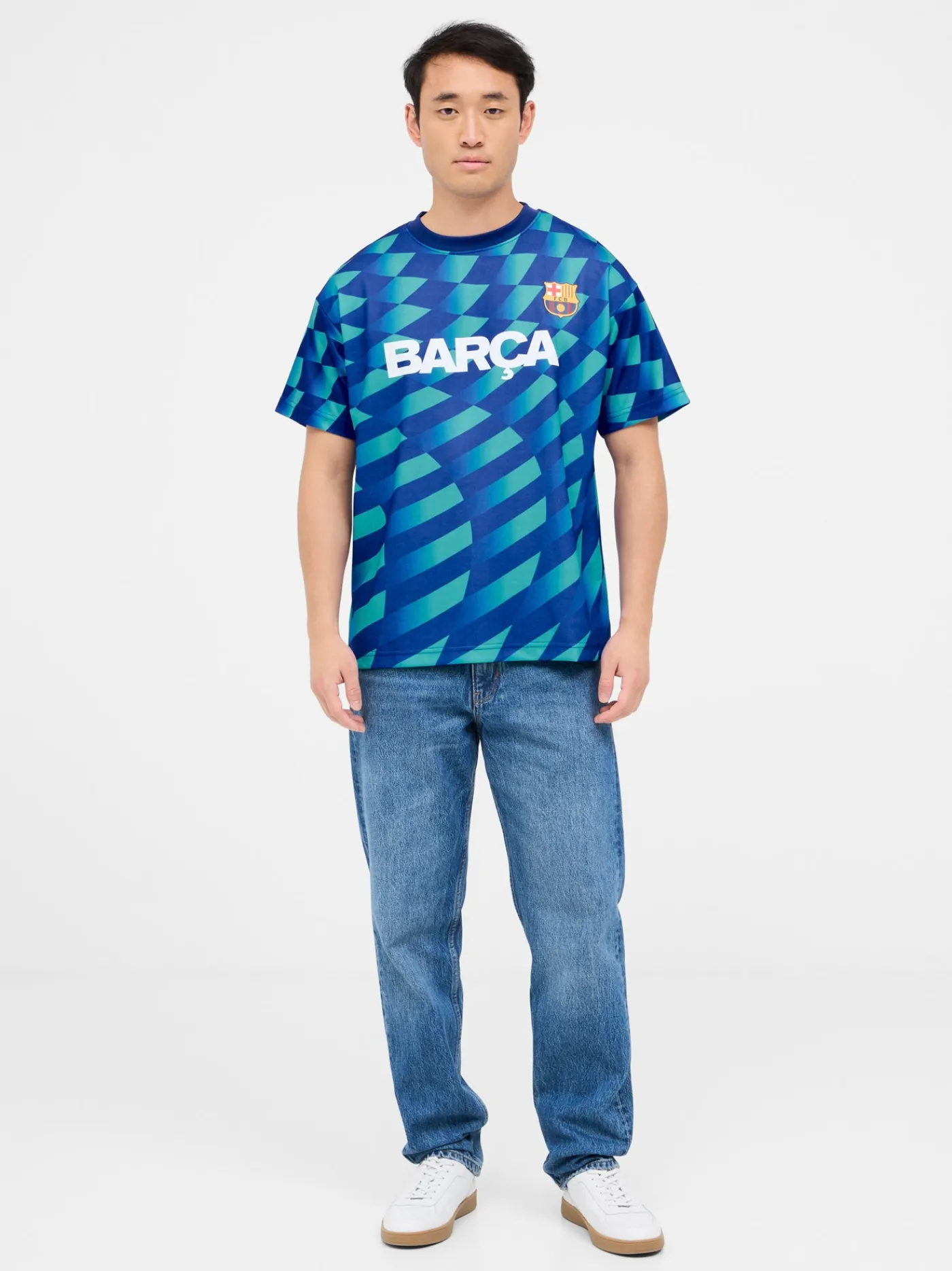 Camiseta de manga corta con estampado integral. Con la palabra “Barça” y el escudo del equipo FC Barcelona en el delantero y “1899” en la espalda. Cuello redondeado. Color: azul y turquesa.