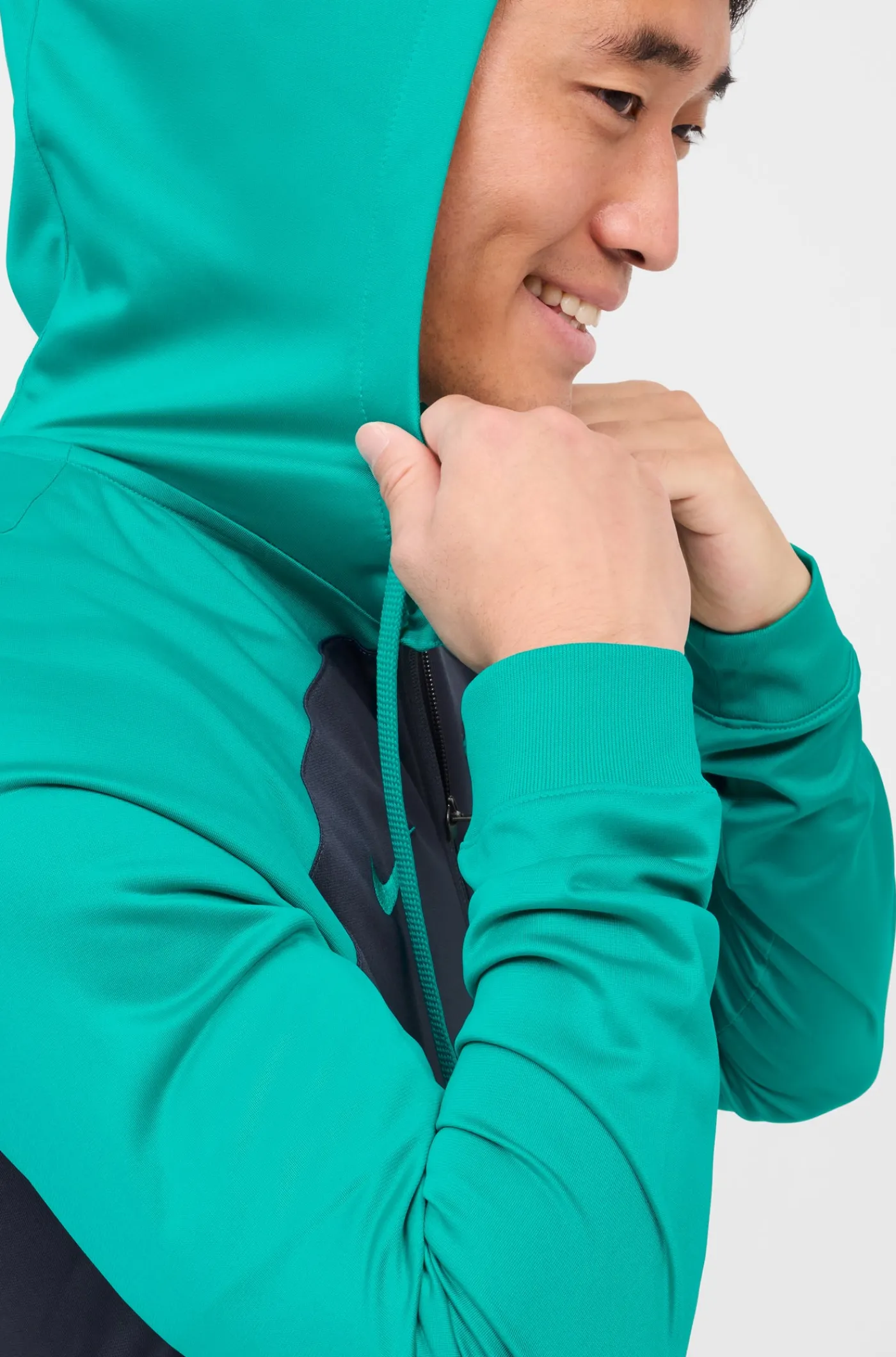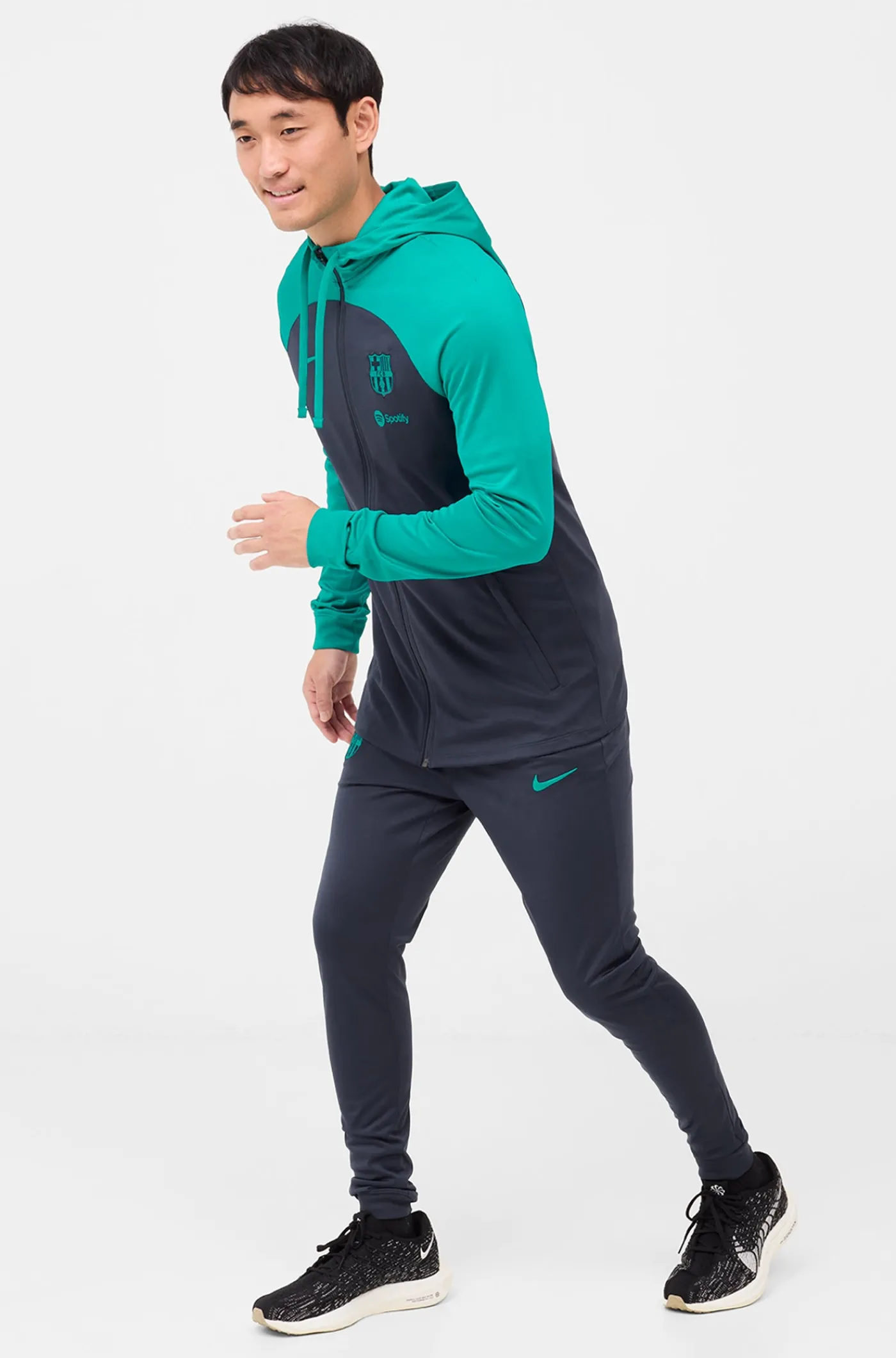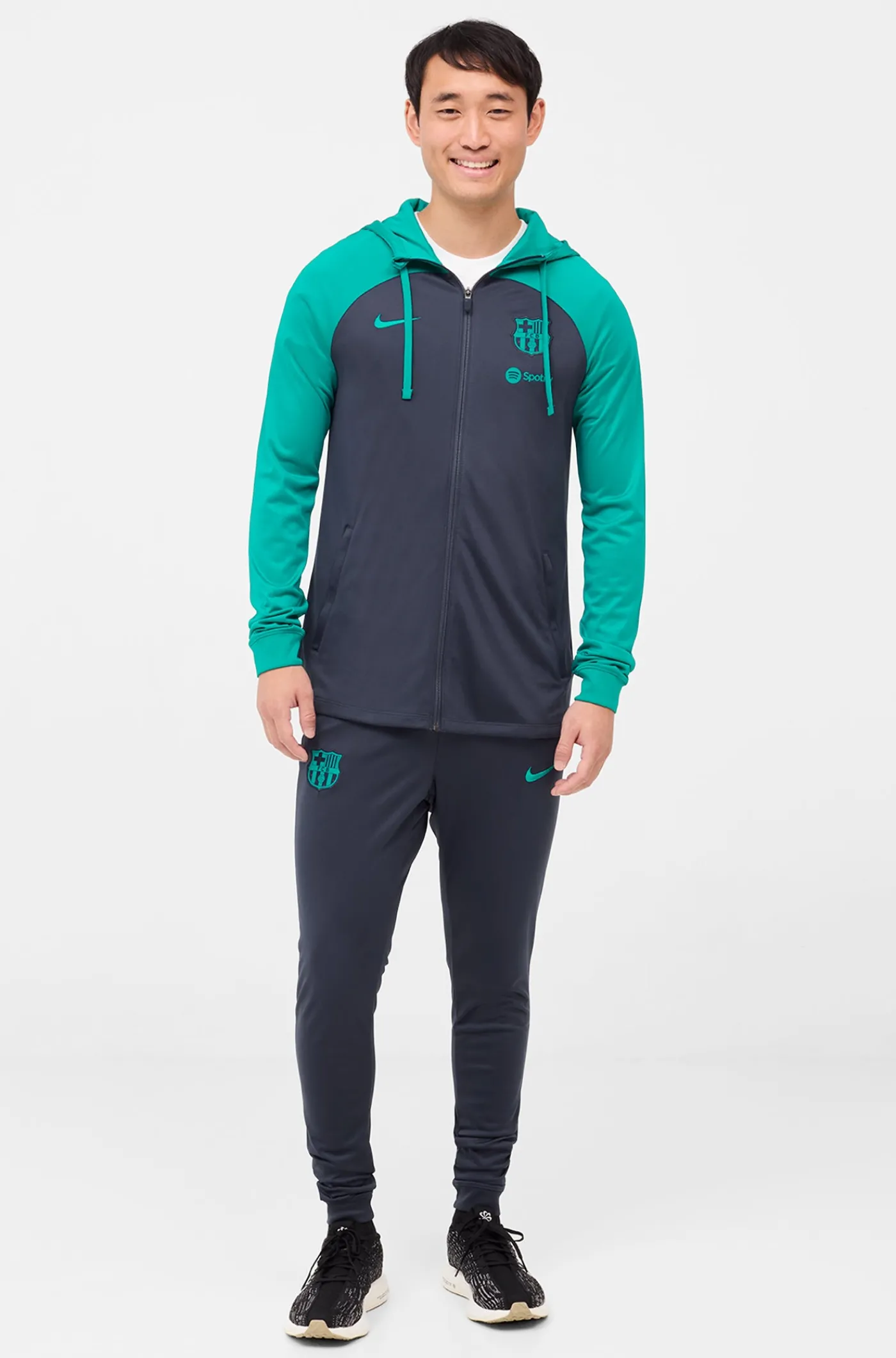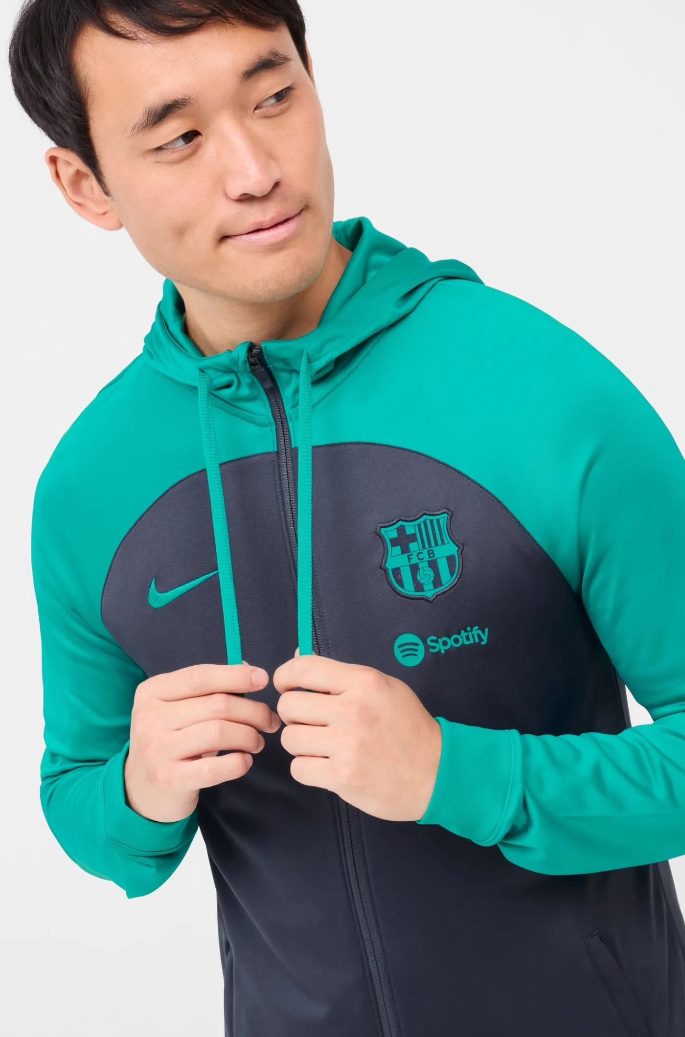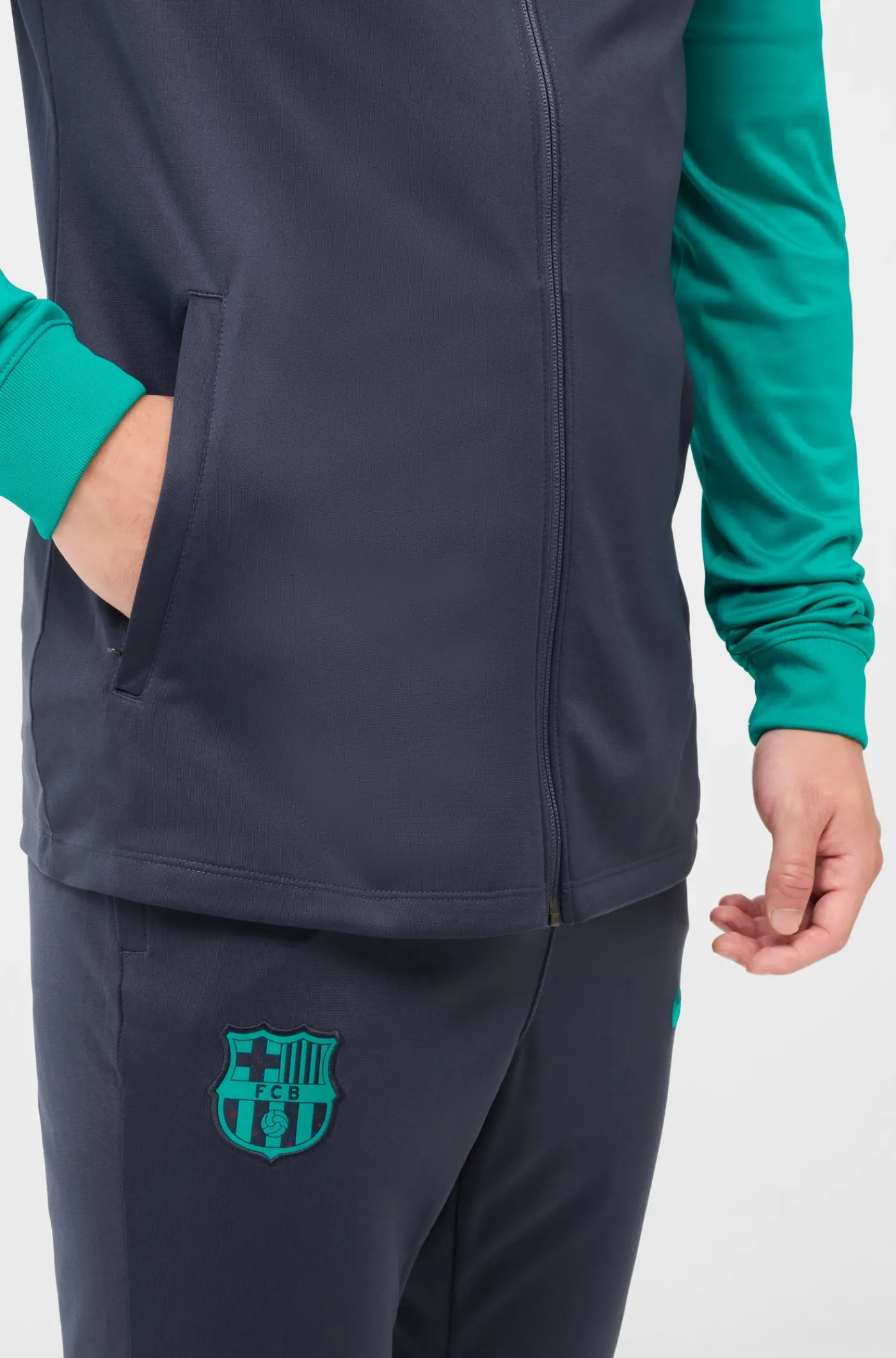 Chándal de entrenamiento con el parche del escudo del FC Barcelona y el logo de Nike bordado a contraste. Tecnología Dri-FIT de Nike. Chaqueta con capucha y cuello alto. Cierre con cremallera. Bolsillos delanteros con cremallera. Pantalón largo con cintura elástica con cordones en su interior. Bajos con cremallera. Color: azul y verde.
