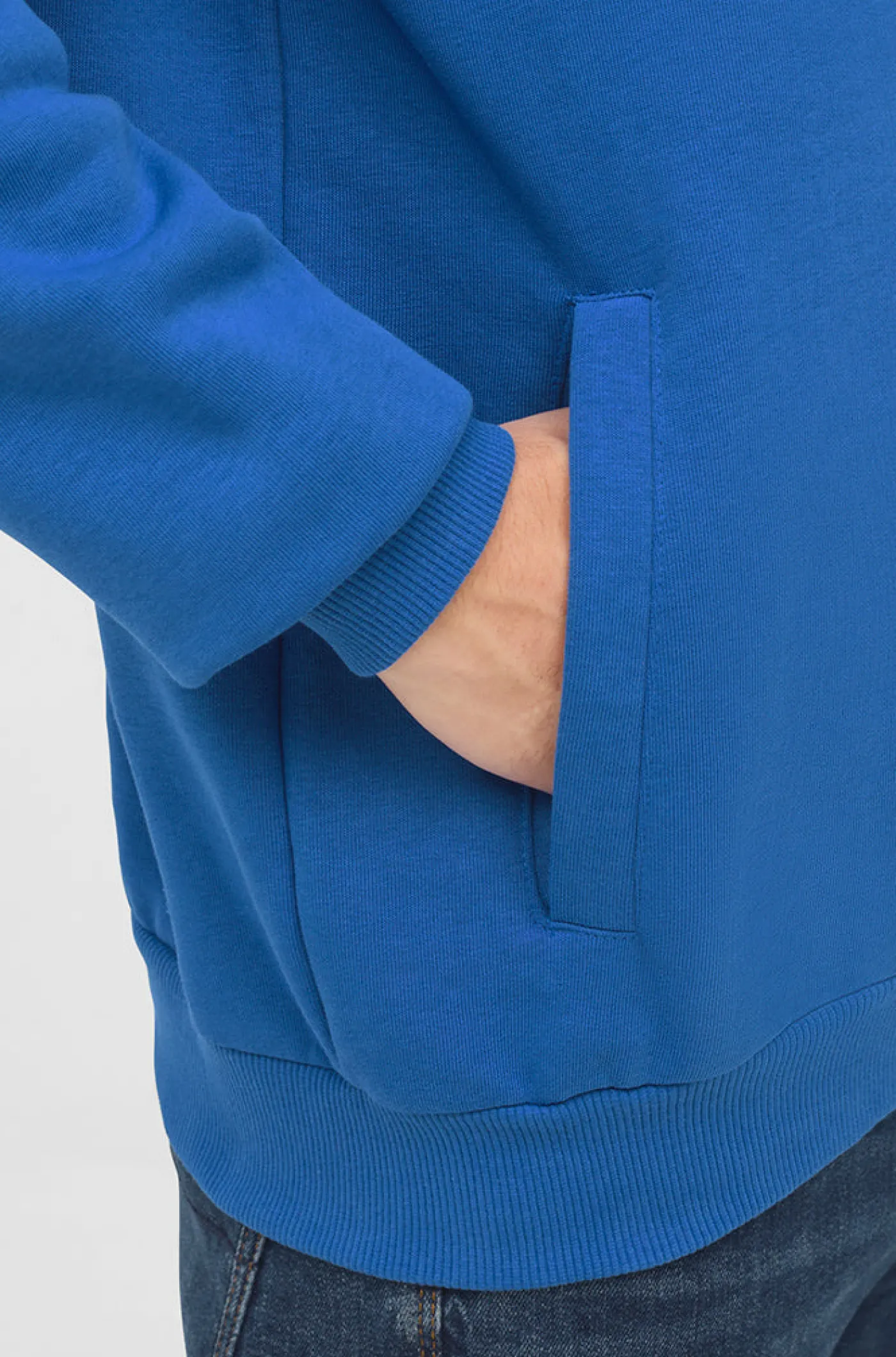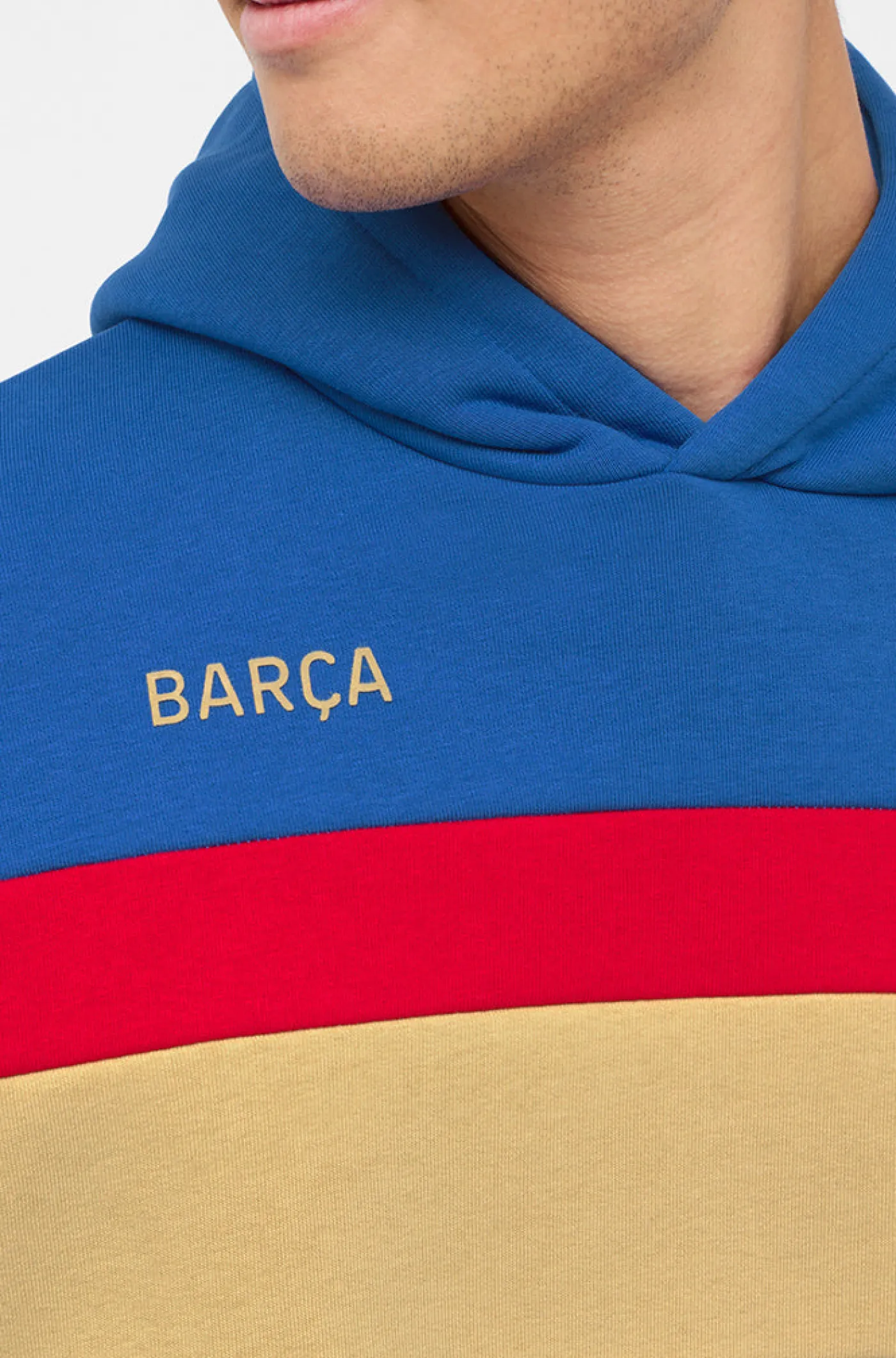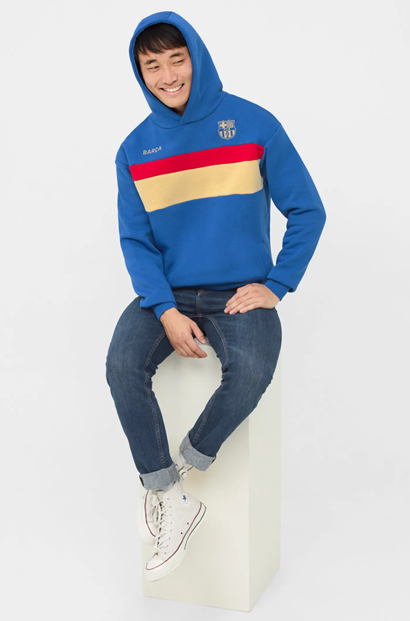 Sudadera con capucha y escudo del FC Barcelona. Detalle de dos bandas a contraste en el pecho. Interior de felpa ligera. Manga larga. Cintura y puños elásticos. Bolsillo canguro. Color: Azul, dorado y rojo