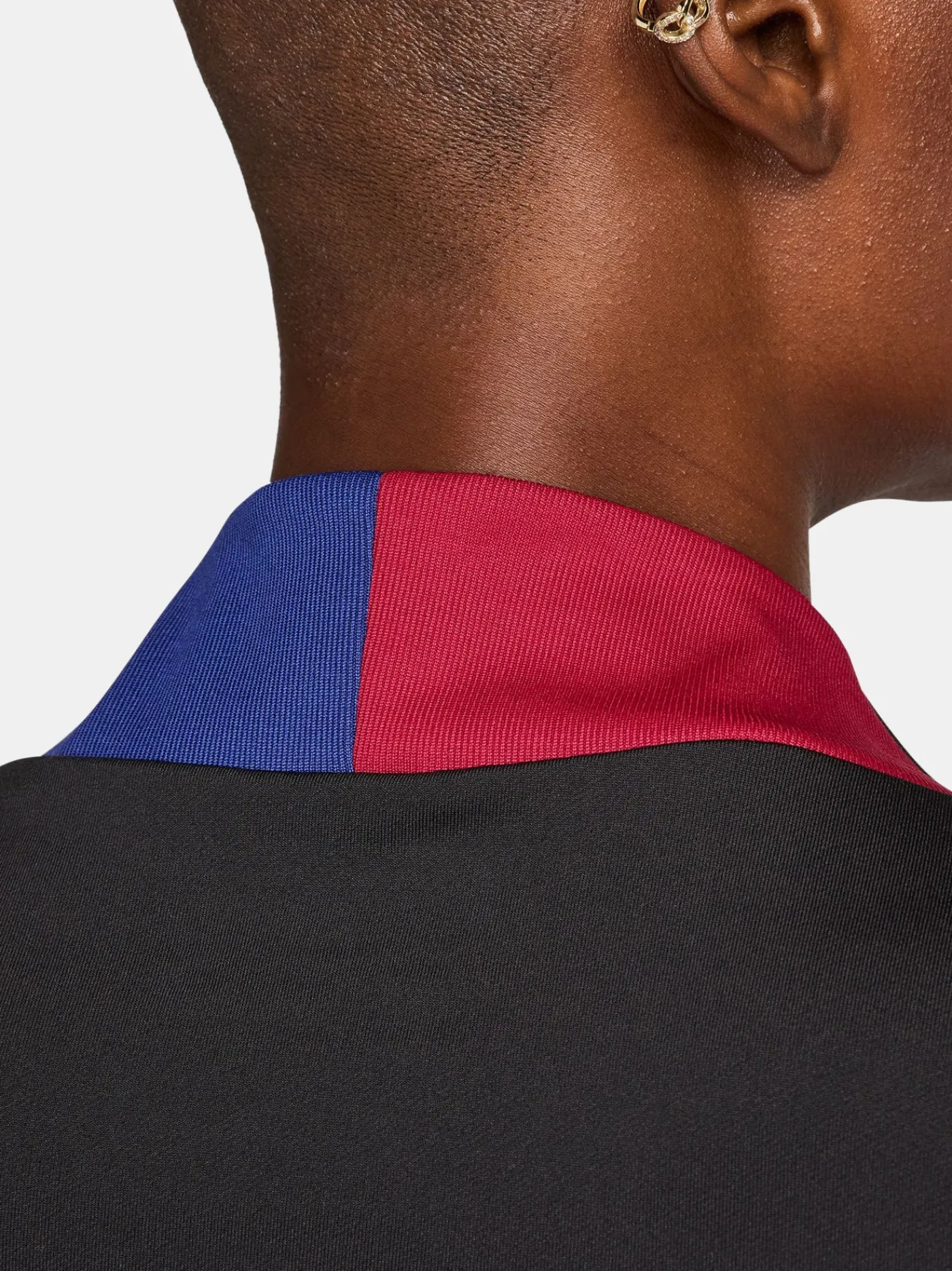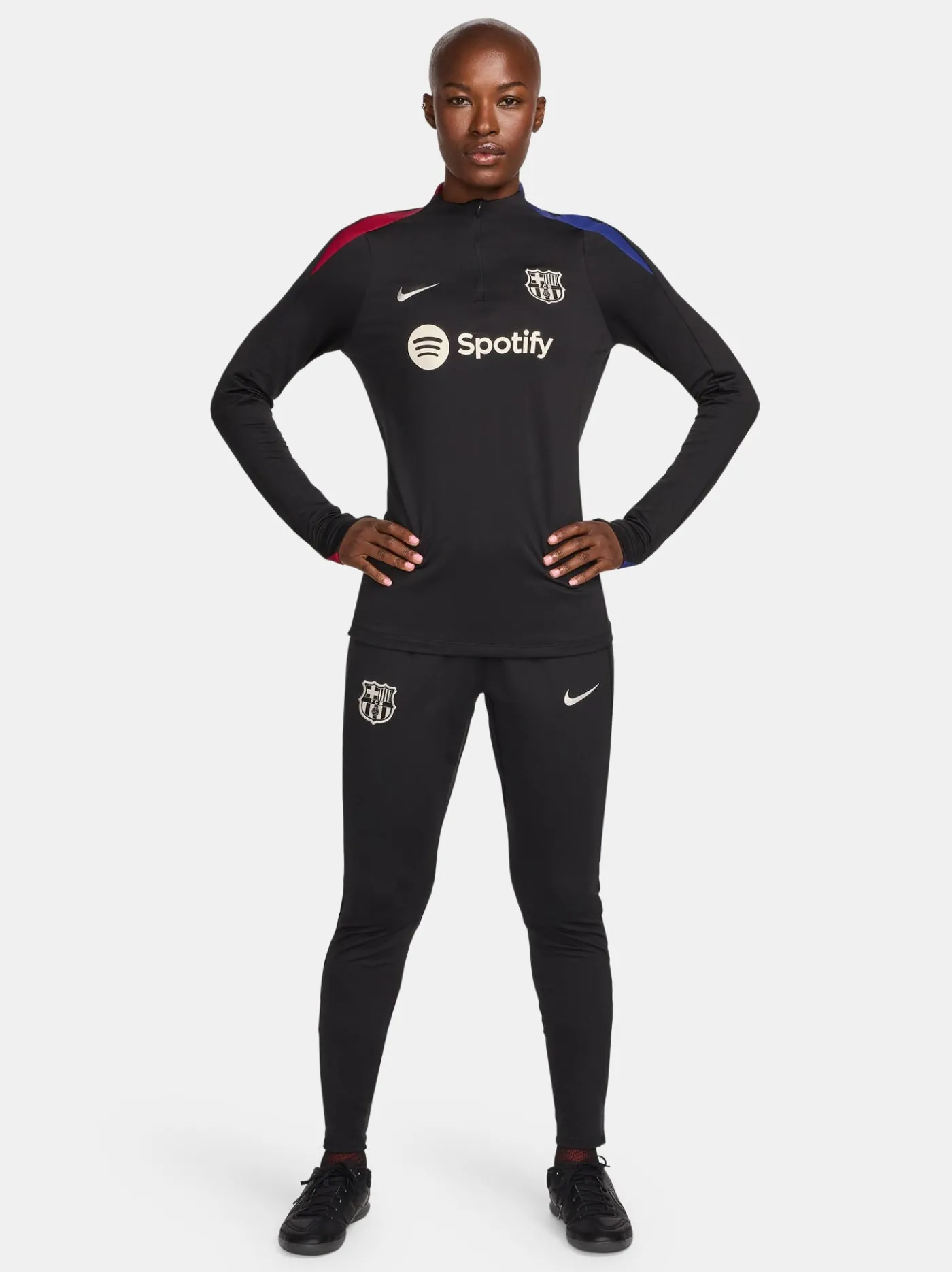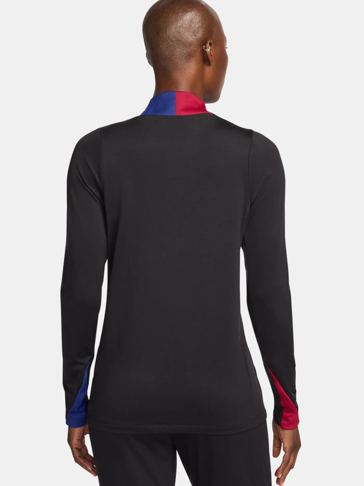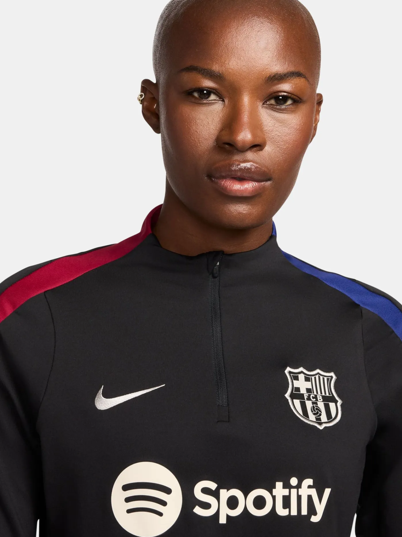 Sudadera del FC Barcelona de la temporada 24/25 para mujer, que usan los jugadores del primer equipo para calentar antes de salir a correr al terreno de juego durante los partidos. Camiseta con parche del escudo del FC Barcelona y logo de Nike bordado. Escote redondeado. Mangas largas. Tecnología Nike Dri-FIT. Color: negro.