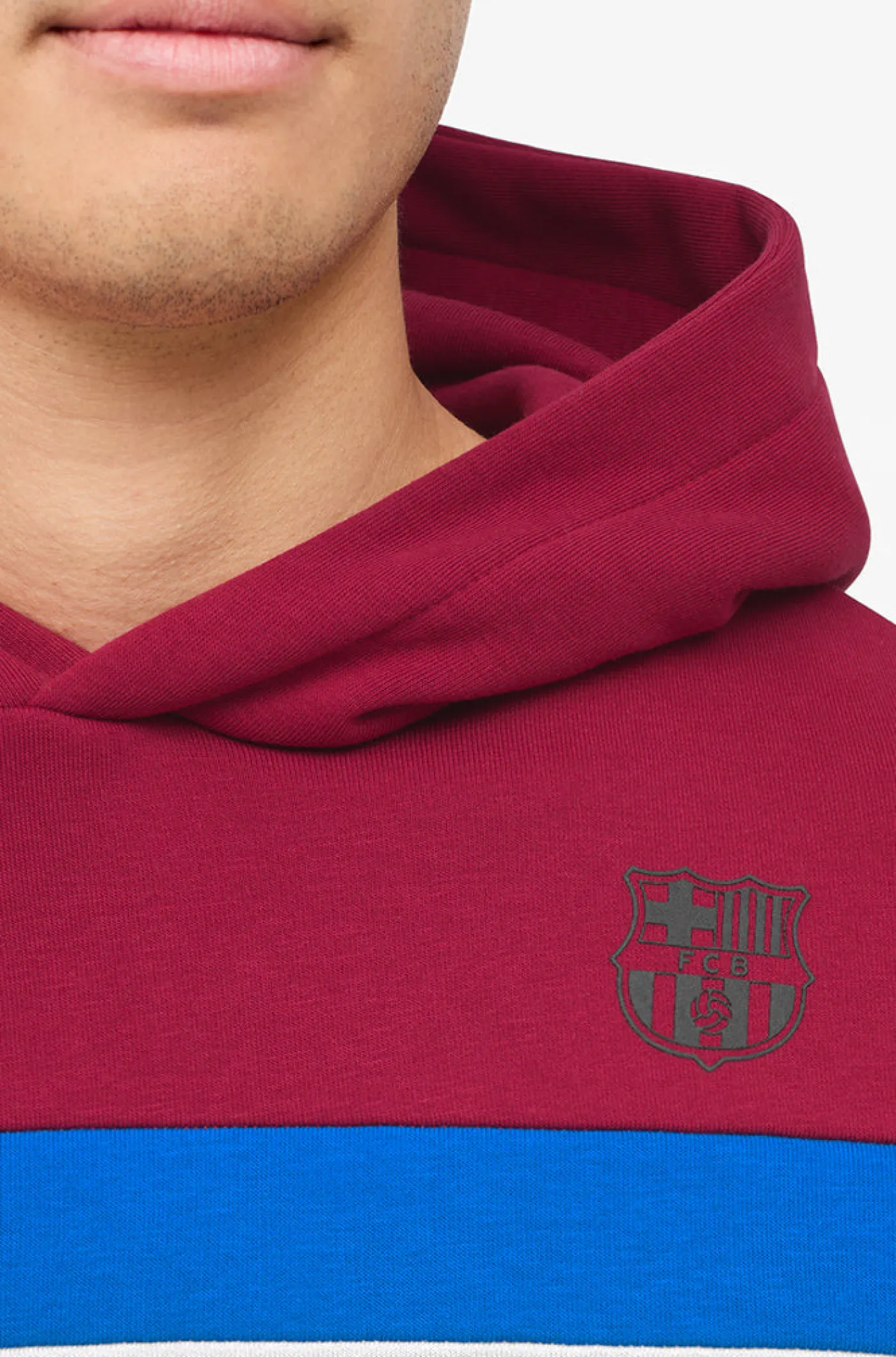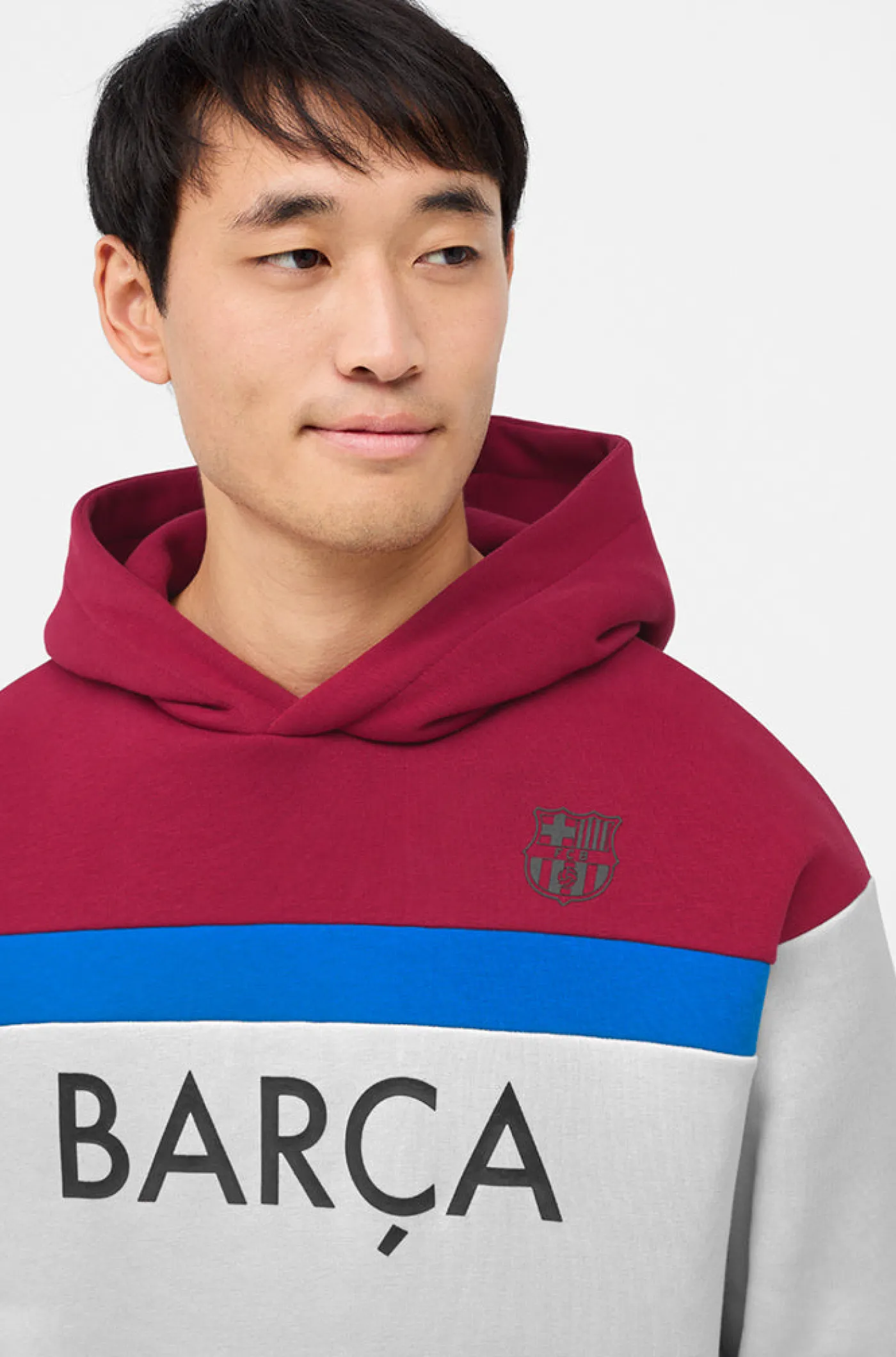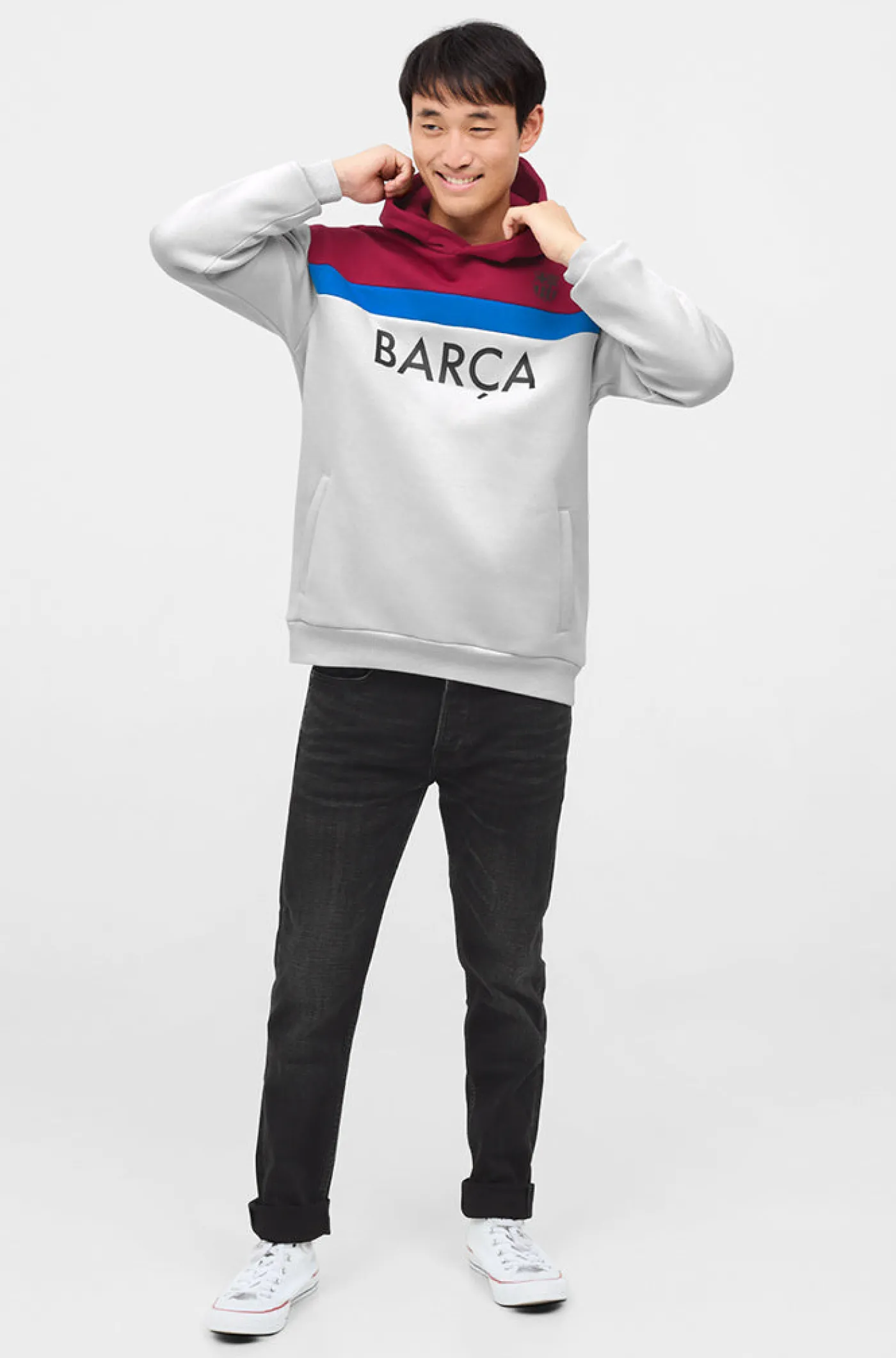 Sudadera de la colección Urban del FC Barcelona. Con capucha y rotulación de “Barça” en relieve. Interior de felpa ligera. Cuello alto con cordones ajustables. Manga larga. Cintura y puños elásticos. Bolsillo canguro. Color: Gris, grana y azul.